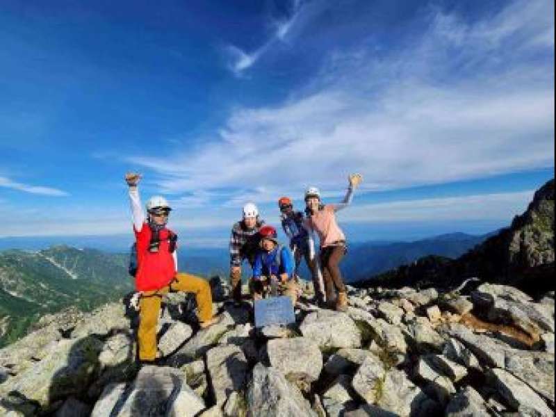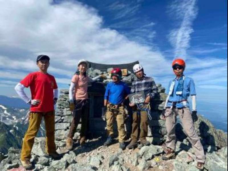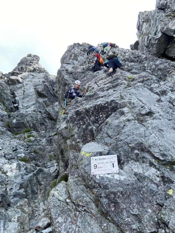 2日目は荷物をデポしで剱岳に向かった。剱岳はそれほど登山者も多くなく、デポで行ったので(デポでもヘルメット、ハーネスを装備、ロープ、ギヤを持参)登り、下りとも快適、カニとのタテバイ、横ばいの岩場を適当なスリルで楽しめて貰えた。