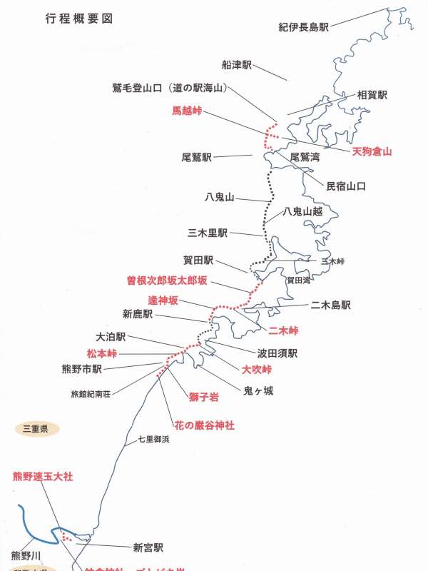 民宿8:20=尾鷲駅9:02=JR=9:25賀田駅9:30-9:50曽根次郎坂登山口ー10:45甫母峠ー12:30二木島駅13:00-13:50二木島峠14:00-14:20逢神坂峠-⑳-新鹿駅16:23=16:33熊野市駅ー旅館ー花の巌谷神社―17:35旅館