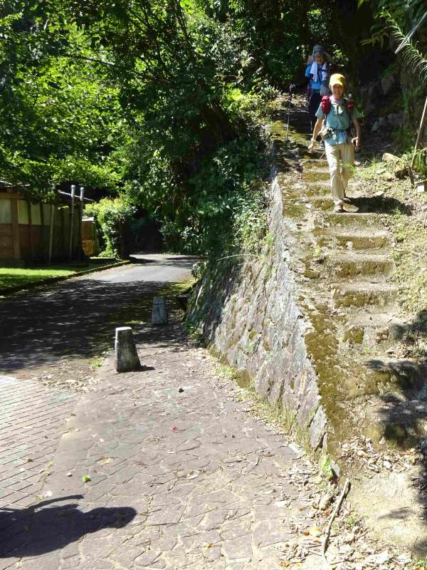 苔むした石畳は木の根っこで几帳面に抑えられている、甫母峠(ほぼ)を過ぎると緩やかな下りになり二木島(にぎしま)の集落に出る。風もある絶好の休憩所で昼食を済ませて、二木島峠へ向かう。