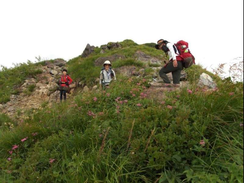大町温泉に前泊して6:00出発、五竜とおみ駅からゴンドラ&リフトで1100m稼ぐ。1673mの地蔵の頭から五竜山荘まで778mの登り。涼しく快適な気温でホッとする。木道(お花畑)を迂回して、視界の良い小遠見山、大遠見山、西遠見ノ池を経て、雪の重みで曲りくねったダケカンバの間から鹿島槍や五竜岳が視界に入る。西遠見から梯子、岩場のクサリがあり慎重に進む。尾根の上部にはお花畑が広がり疲れを忘れる。やがて白岳の稜線に出ると急に風が強くなり視界不良になるが予定より一時間早い到着で良かった。