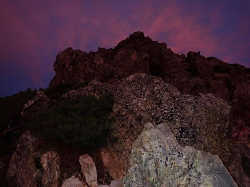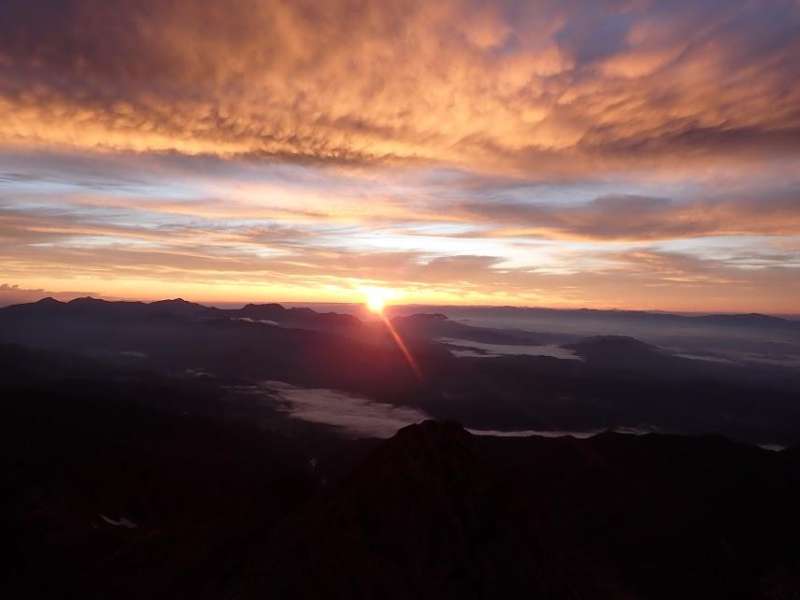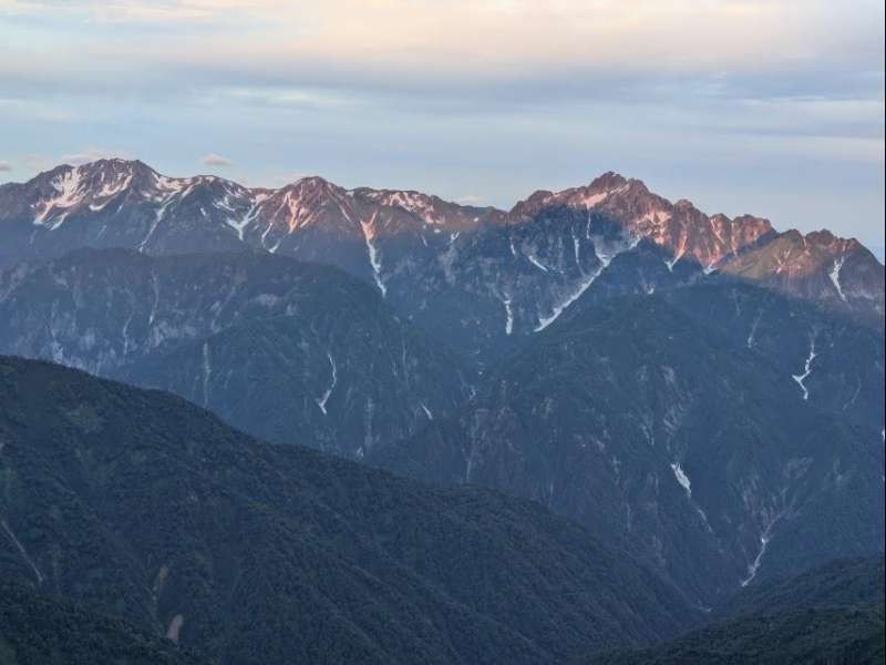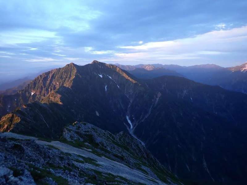 翌朝4:00五竜岳に向け出発。30分後には美しい朝焼け。露岩の斜面を慎重にひたすら登り鎖場を越え、やがて山頂、立山剣岳を正面に360度の大展望、お天気に感謝。