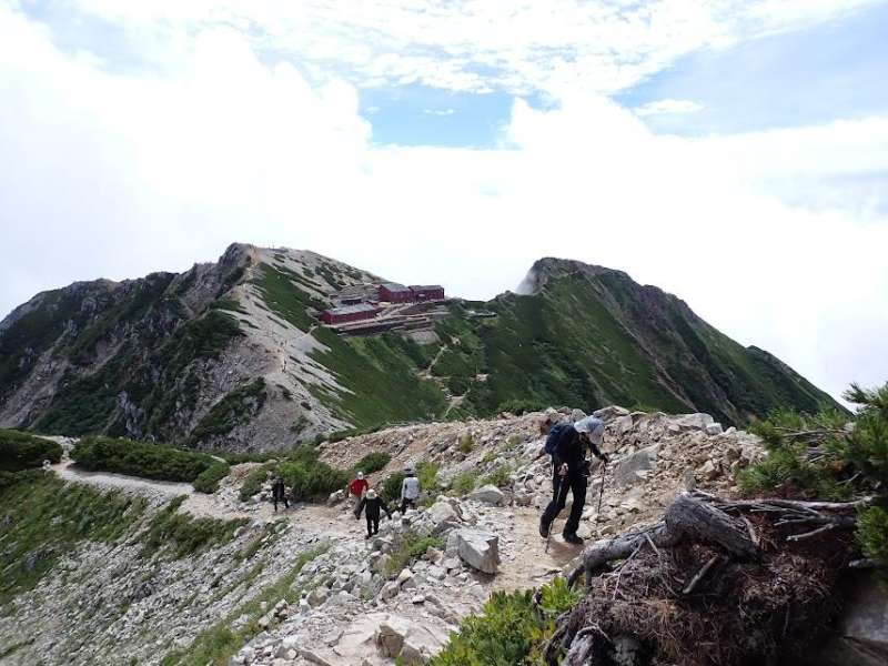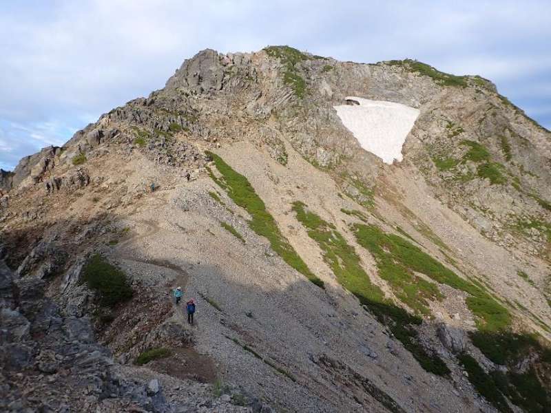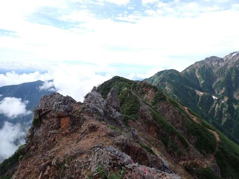 下山後、唐松岳に向け出発。ハイマツ帯の稜線は視界よく清々しい。樹林帯の間を縫うようにアップダウンを繰り返す。大黒岳を通過し牛首の険しい岩稜帯に突入し緊張が一層高まる。すれ違う人も少なくて有難い。