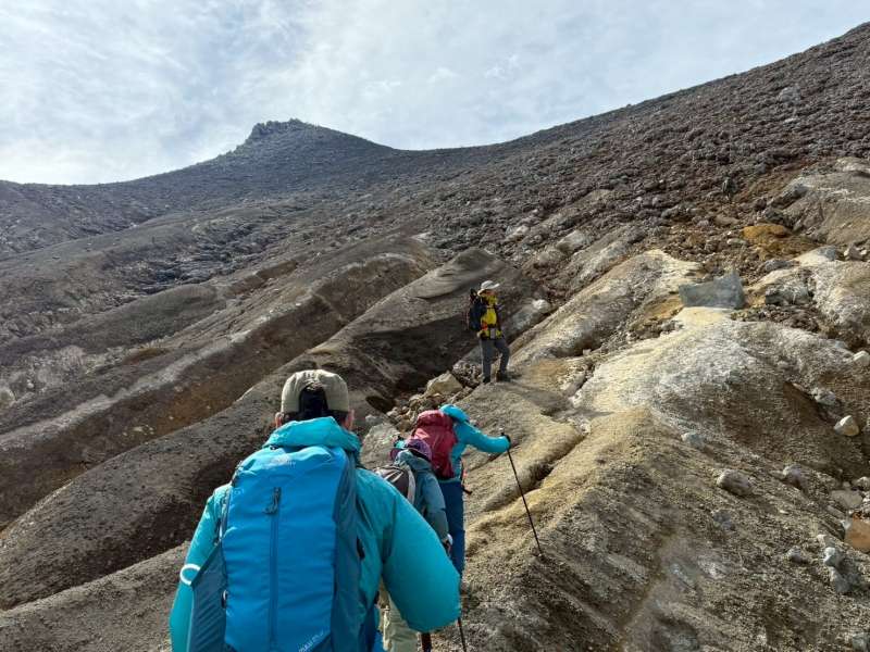 望岳台から登り始める。避難小屋を過ぎた辺りから火山のガスが風に乗ってやってきて咳き込んでしまう。昭和火口を過ぎ、なだらかな道が終わると十勝岳への急な山道が始まる。登りやすいが、下りは細かく砕けた溶岩で滑る。(MT)