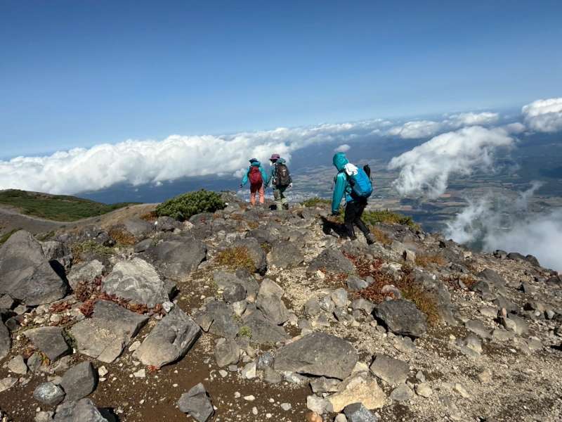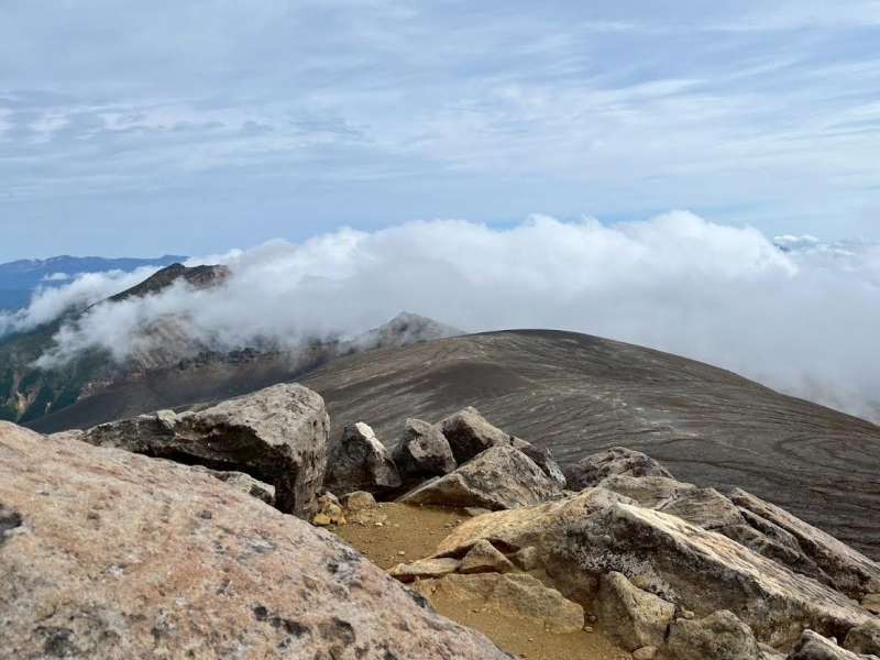 9/15 熊の目撃情報のない山域とのことだったが、やはり北海道の山は熊が…と思っているので怖い。早朝の暗い中は、笛や手叩きなど鳴り物いり。頂上に近づくにつれ、風が強くなってきたが、十勝岳よりはマシ。途中、ガスに包まれるシーンもあったが、山頂やお鉢巡りではガスが吹き飛ばされ、眼下に北海道ならではの雄大な風景が広がり、豊かな開放感を味わった。(SO)