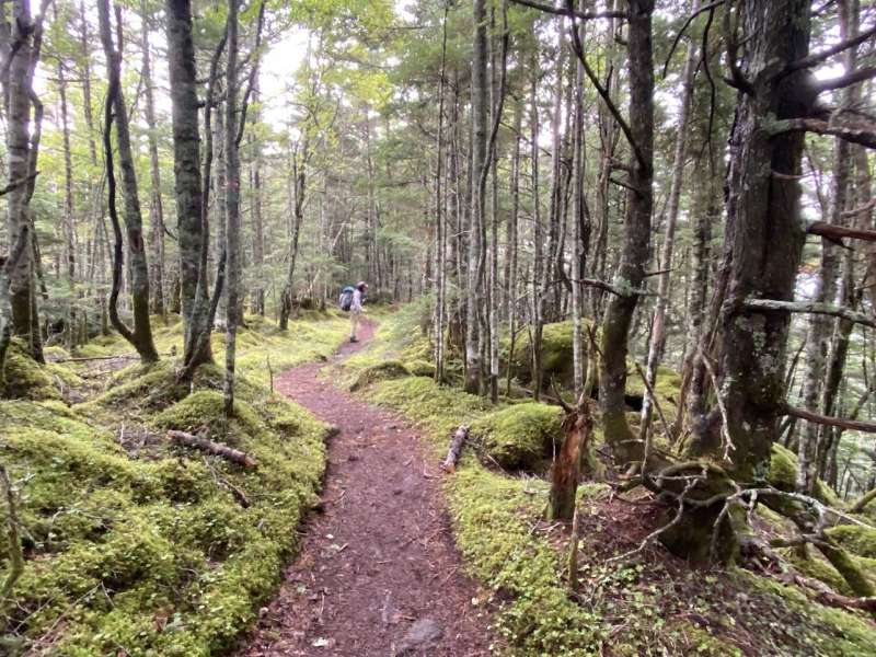 21日6:30に出発したが、昨日同様の暴風雨の為小屋に引返し待機する事に。やがて雨がやみ、出発。風も赤岳山頂を過ぎると弱くなり安心する。かなりの方達とすれ違う。時々姿を現わす中岳、阿弥陀岳の絶景を想像しつつ進む。西の肩ではガスが去り阿弥陀岳までの稜線、富士山、しばしの絶景、写真タイムを楽しむ事ができた。何度見ても最高のロケーションだ。阿弥陀岳の下りを過ぎ水場からは苔と木立の緩やかな道。シラビソのクッションが脚に優しい。