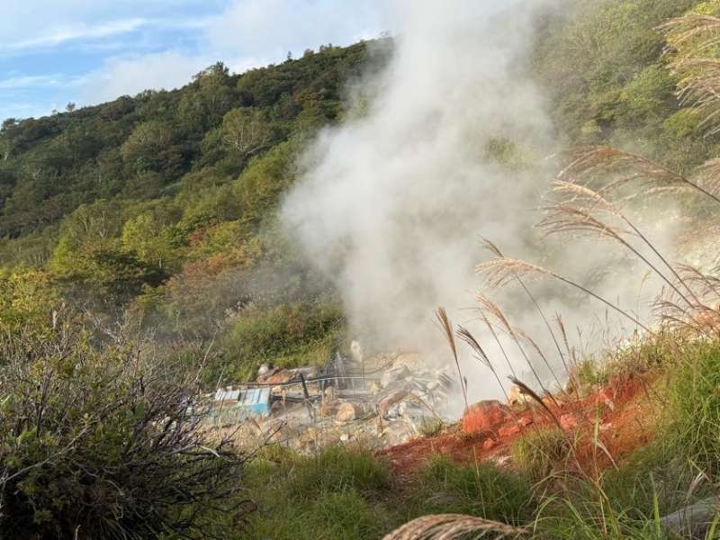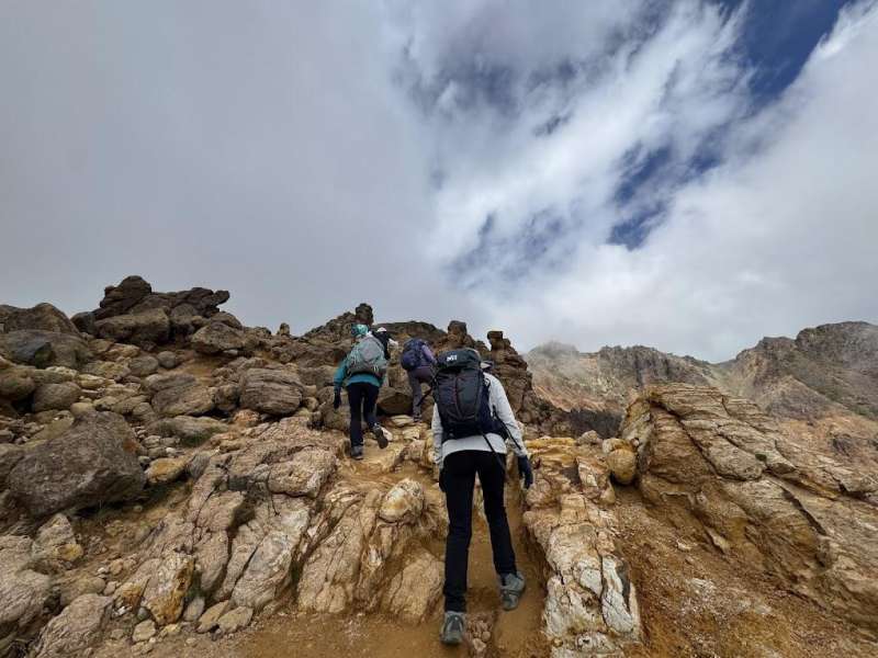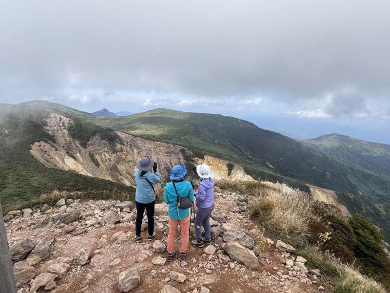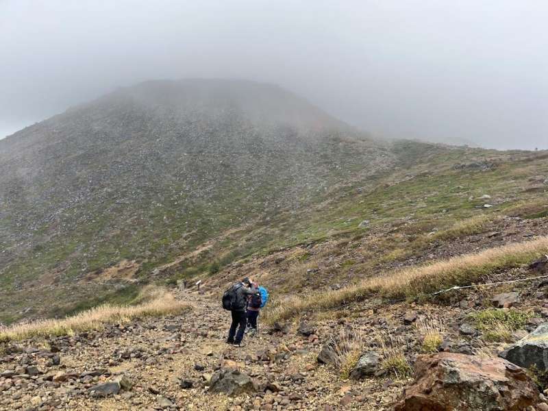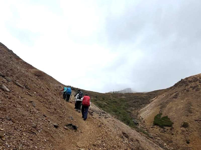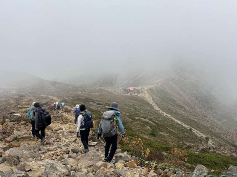 9/28 那須岳ロープウェイ山頂駅まで時間どおり到着。茶臼岳に向かい登山開始から曇りでガス多め。雲の切れ間から時折山頂景色が見え隠れし、景色はコロコロ変わる。茶臼岳に登頂した時も辺りは真っ白だったが、お鉢回りで山頂の祠付近にいた時、少しの間雲が引き、お鉢の中をはっきりと見ることができた。風が強いのでお鉢をまわったら峰の茶屋まで下りる。風の当たらないところで昼食休憩をとった。朝日岳に向かい少し行くと岩稜帯が朝日の肩まで続く。全員問題なく通過していた。朝日の肩にザックを置いて朝日岳登頂。朝日岳山頂では雲が引き、青空も見え、辺りの山並みと始まったばかりの紅葉風景がとても綺麗だった。名残惜しくも朝日岳を跡にして隠居倉への尾根を歩く。隠居倉を通過し、しばらく行くと煙が立ち上っていた。三斗小屋温泉煙草屋の露天風呂源泉だった。そこからまた歩き三斗小屋温泉大黒屋到着。温泉に浸かり、夕食、泊。宿のご主人によると今夜から雨、明日の午前中まで降ったり止んだり。雨が上がると風が強まる予報。明日の三本槍岳は無理しないで、とのこと。