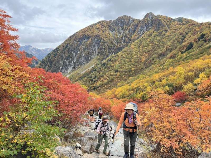 予定より30分早く出発、林間コースが心地よい、おさるの群れ、屏風岩の絶景を見ながら本谷橋へ。ここで休憩、相変わらず人が多いまたツアー登山グループが続々とやってくる。どんどん紅葉が美しさを増しSガレでの紅葉のパノラマがすごい。その後も息をのむような美しさが続く。