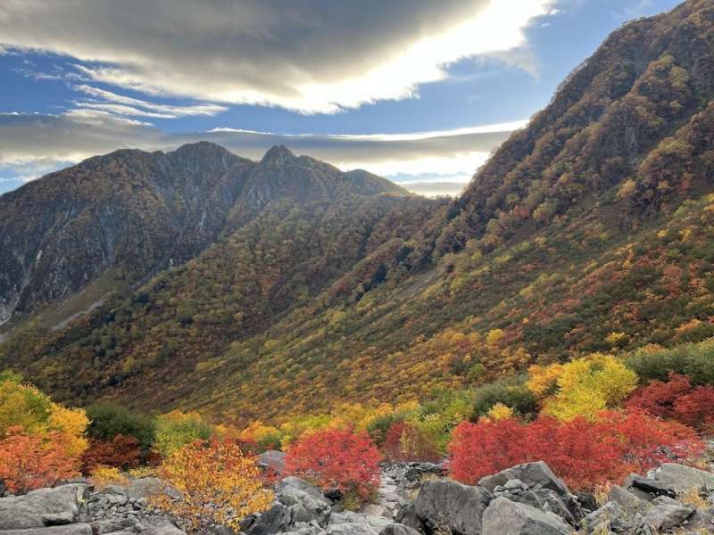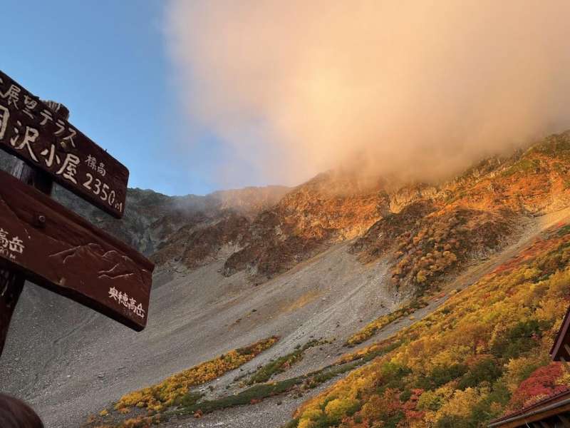 今回は天気に恵まれ、横尾ではモルゲンロートが楽しめ、紅葉はベストシーズンの上に例年以上の美しさでした。気温も10数度有り快適。