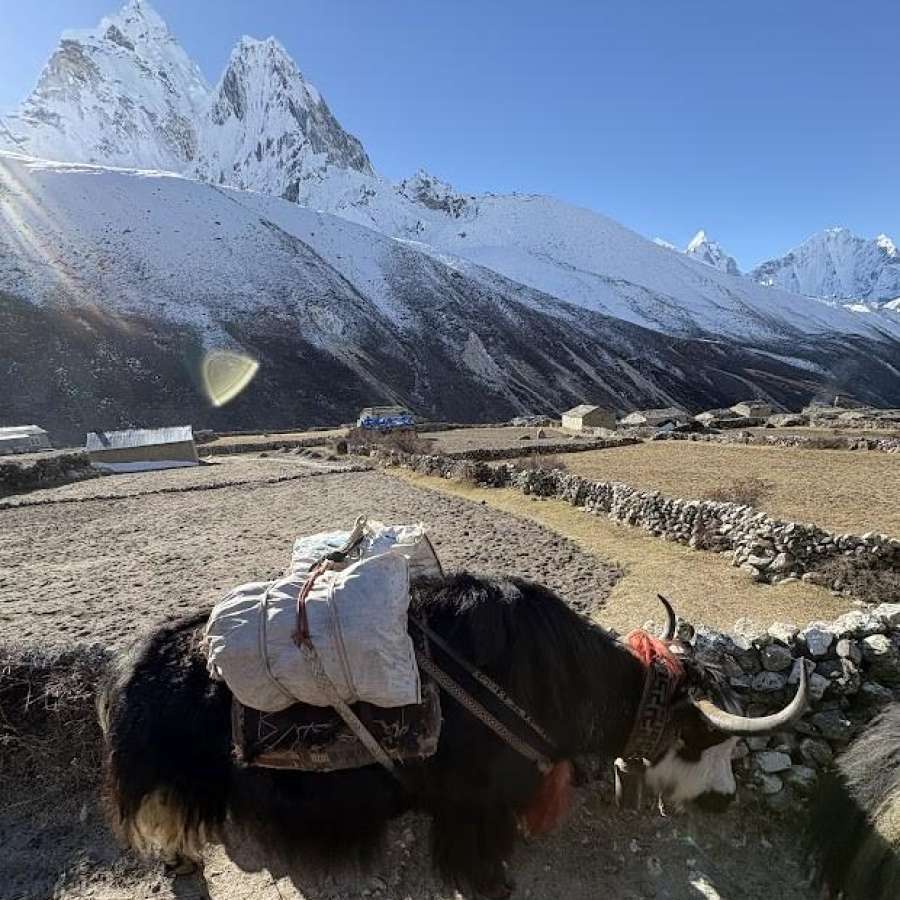朝、ようやく雲の切れ間からアマダブラムはじめ白い峰々が見えた。日中はやはり雨だったが荷物を運ぶロバやヤクなどと共に楽しく歩きデポチェへ。デポチェはチベット仏教の立派なお寺があり朝5時に鐘がなり大音量でお経が流れていた。
