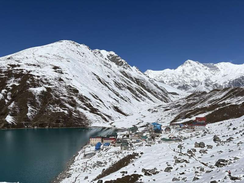 峠を越えてから周りの景色も変わり、雪と灰色の砂礫のような地層、凍った池など異世界のような雰囲気に。それだけにゴーキョに着いて見えた青緑色の湖がとてもきれいだった。