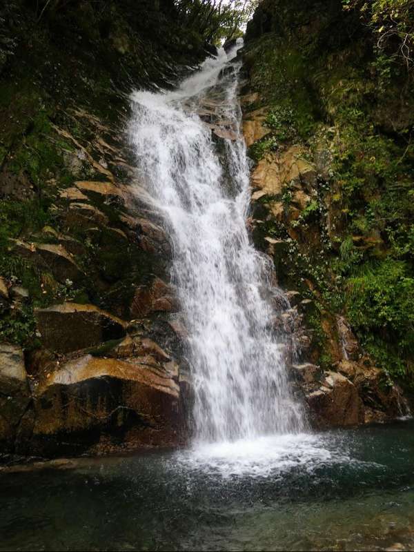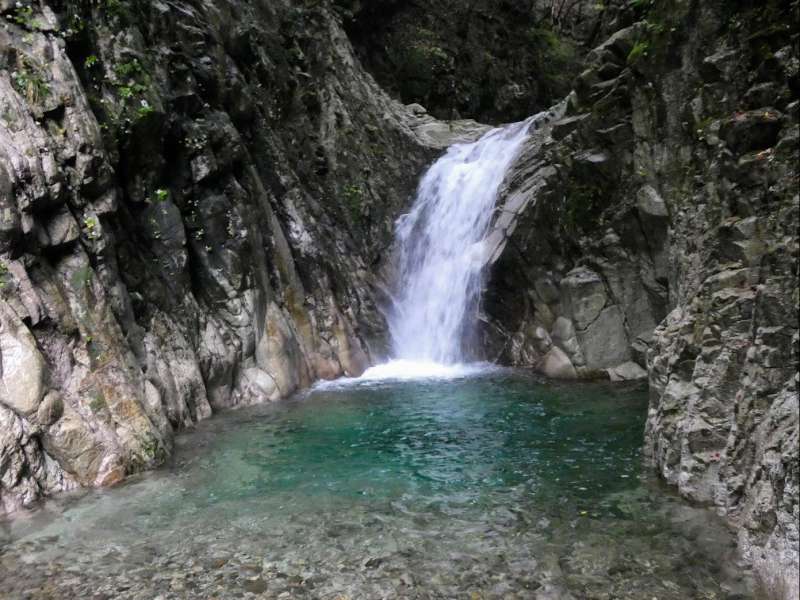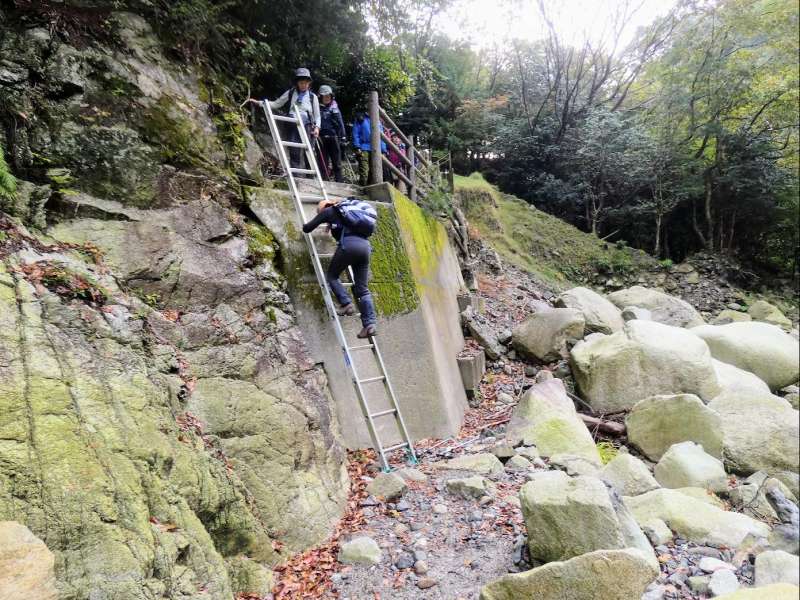 閉鎖された車道をしばらく歩いて長尾滝への分岐から沢道に入る。ちょっとスリリングな徒渉やへつりを繰り返して長い鉄梯子を下りると長尾滝に出る。高さ20mほどの立派な滝だ。さらに沢沿いを中道登山道との合流点を経て40分ほど進むと金山登山道分岐だ。ここからは朝歩いた道を辿って、予定通り15:00に宇賀渓駐車場に帰着した。