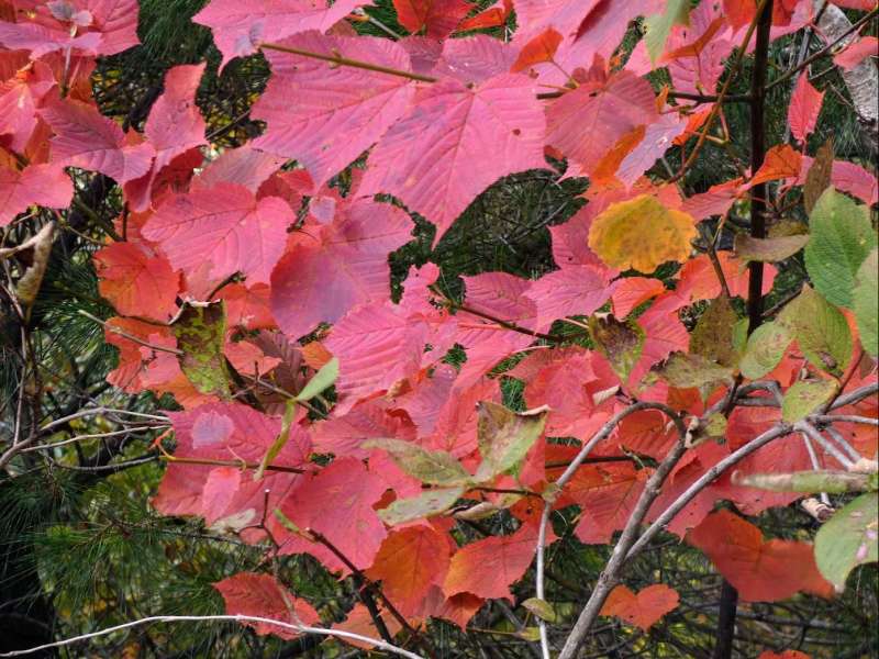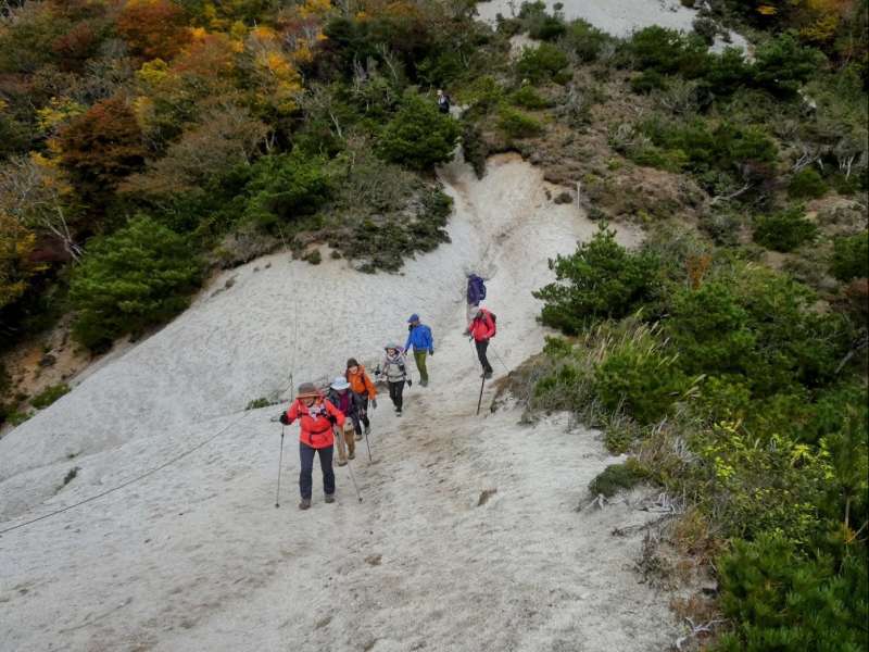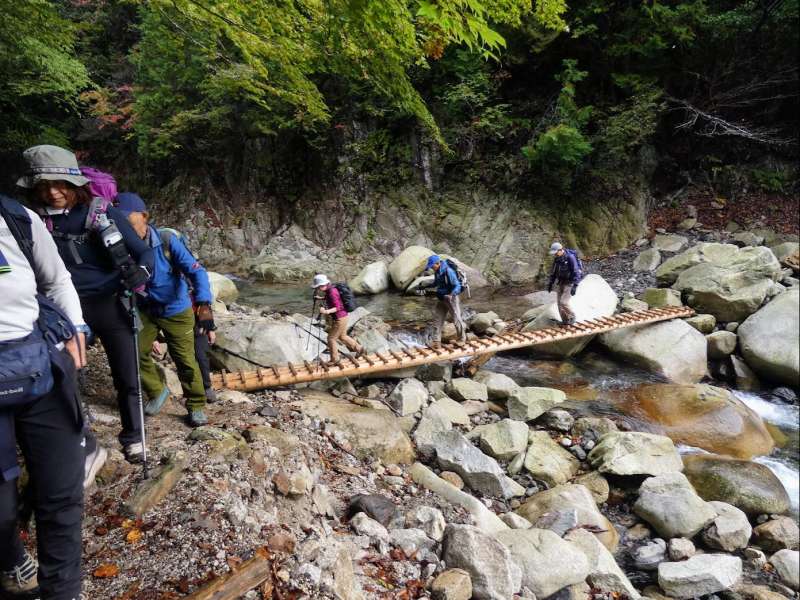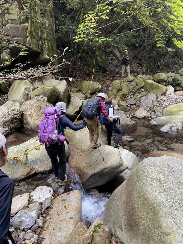 竜ヶ岳は、沢あり滝あり岩あり、しっかりと登らされる尾根道あり長閑な草原の稜線ありと、1100m足らずの低山ながら非常にバライエティーに富んだコースでとても楽しめた。さらに紅葉が素晴らしかった。有名なシロヤシオの”赤い羊”は言うまでもなく、中部地方以西に分布し関東には少ないシロモジの鮮やかな黄色が美しかった。ただし、6時間以上歩ける脚力と徒渉やへつりをクリアできる技術力、コースの状況や天候の変化に的確に対応して装備を出し入れできる判断力が必要である。