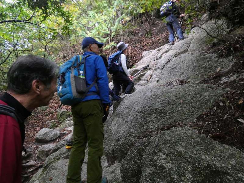 11月2日(竜ヶ岳):6:30に登山口の宇賀渓の立派な駐車場(1日500円)に到着。50台ほどの駐車スペースはまだ半分位空いていたが次々に車が入って来ていた。しばらく車道を歩く。遠足尾根の入り口を見送り、梯子を下りるとホタガ谷出合。木橋を渡り青い鉄の魚止橋を渡ると魚止滝の分岐で、滝を見にちょっと寄り道する。登山道に戻り花崗岩の岩場をへつるように進むと金山登山道分岐に出る。