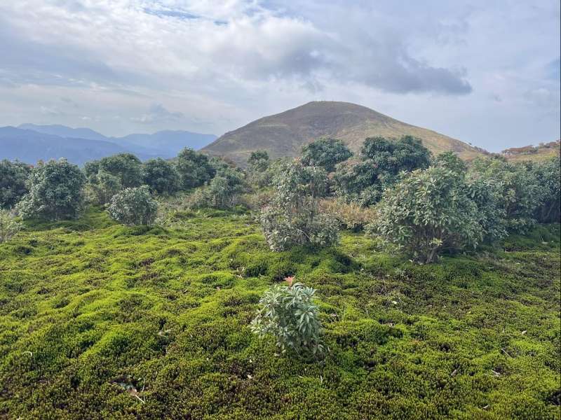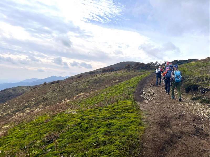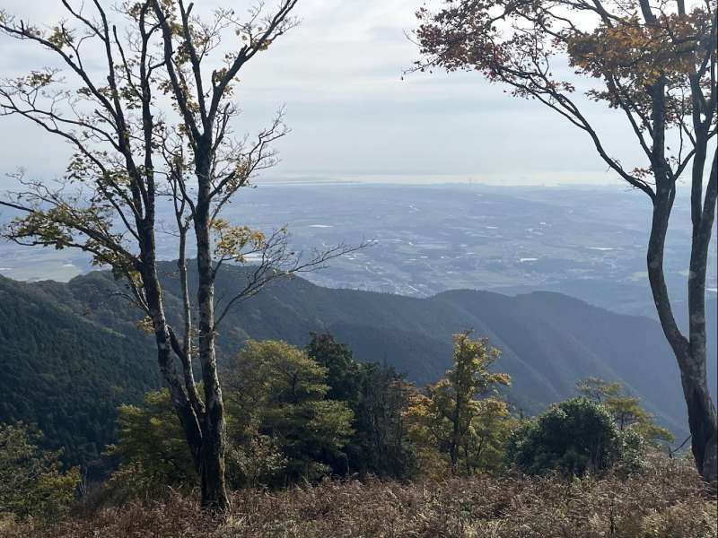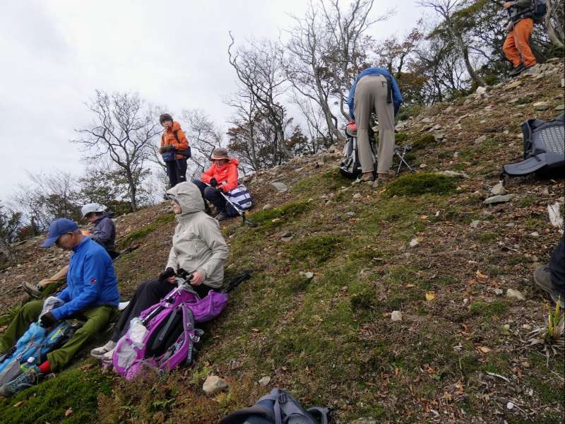金山尾根は岩場あり長閑な樹林帯ありと変化に富み面白いが、800-900mのあたりは急登だ。この急登を凌ぐと急に視界が開け、前方には竜ヶ岳のたおやかな山頂が、振り返ると伊勢湾が見渡せる。ここから遠足尾根との合流点を過ぎて山頂までは基本的には草地だが、所々に灌木帯がありそれが赤く色づいている。”赤い羊”と呼ばれるその正体は紅葉したシロヤシオだ。”赤い羊”を愛でながらなだらかな(最後はちょっと急)な稜線を進むと竜ヶ岳山頂(1099.6m)に到着。
