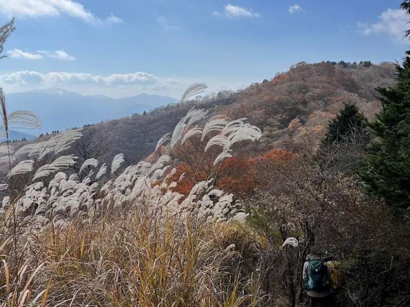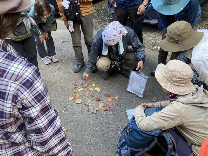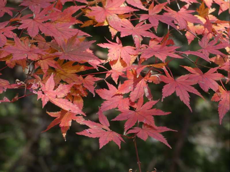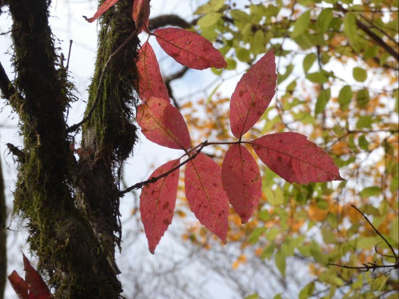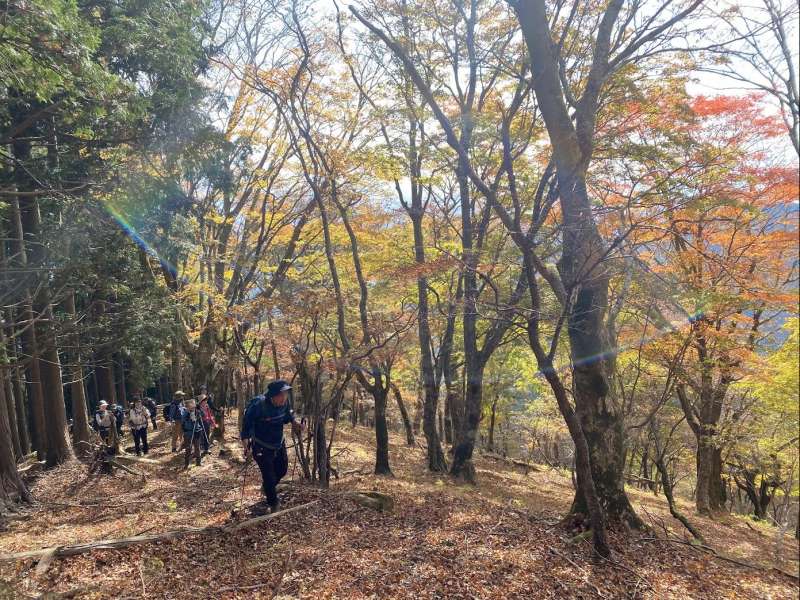 紅葉はお天気次第。丹沢でもこんなに美しい紅葉が見られるんだと感動した1日であった。寄水源林の周遊コースから檜岳南東尾根を登り、伊勢沢ノ頭を経由して伊勢沢ノ頭南東尾根を降りて寄大橋に戻る周回コース。はじめは植林帯を歩くが、檜岳南東尾根の南斜面は豊かな広葉樹林だ。標高が低いところのケヤキから始まり、イロハモミジ、オオモミジ、イタヤカエデ、ウリハダカエデ、稜線にはブナ林が広がり、多くはないがヒナウチワカエデ、メグスリノキ、チドリノキも見られた。足元にはリンドウやセンブリ、キッコウハグマがシーズン最後の花を咲かせていた。檜岳へは雨山峠からアプローチする道の方がより面白そうだが、寄水源林から雨山峠への道は長らく通行禁止となっており残念だ。