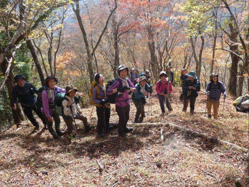 950mあたりからは左手に広葉樹林帯が開けて、紅葉がまぶしい。1100mからは傾斜も緩み、ほどなく檜岳山頂(1167m)に到着。小休止後、尾根道を南西に辿り伊勢沢ノ頭を目指す。