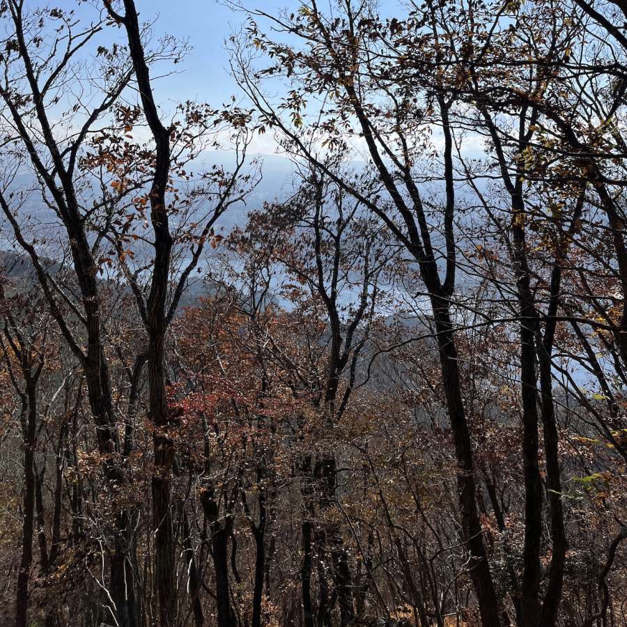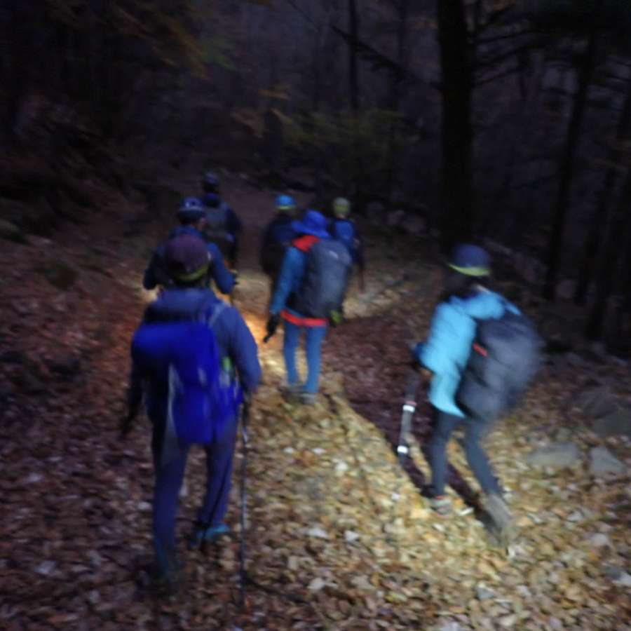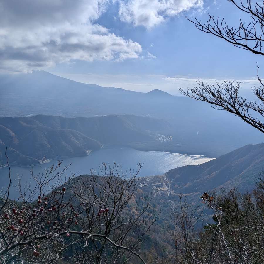 今年2回目の岩稜歩きのトレーニング山行。マイナーな登山口から淵坂峠に向かう薄い踏み跡で一時ルートを失うが地図読みをしてリカバー。峠からは明るい稜線を毛無山まで登り、ヘルメット等を装着して十二のピークを数えつつ岩稜を辿る。メンバー相互に確認しつつ鎖やロープを辿り十二ヶ岳に登りついた。少し寒気の雲もかかるが時々富士も顔を出す晩秋の好天の下、河口湖や西湖を眺める。下りも一か所大きなギャップがあるが慎重に越える。10人の大パーティだったこともあり夕暮れが迫る時間となったので、直接大淵谷を登山口に下るルートと変更したが、その前にスリングによる簡易ハーネスとカラビナランナーによる鎖場通過の練習を実施。最後は林道でヘッドランプを出すこととなったが安全に下山した。よいパーティで楽しい山行であった。