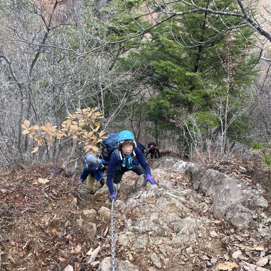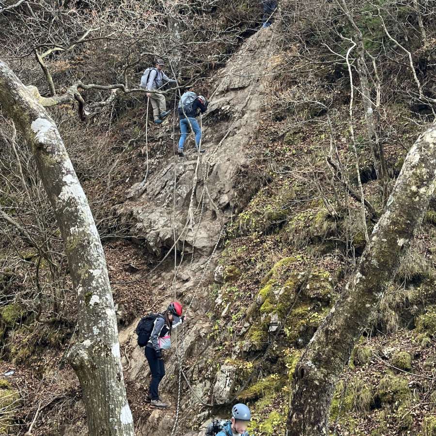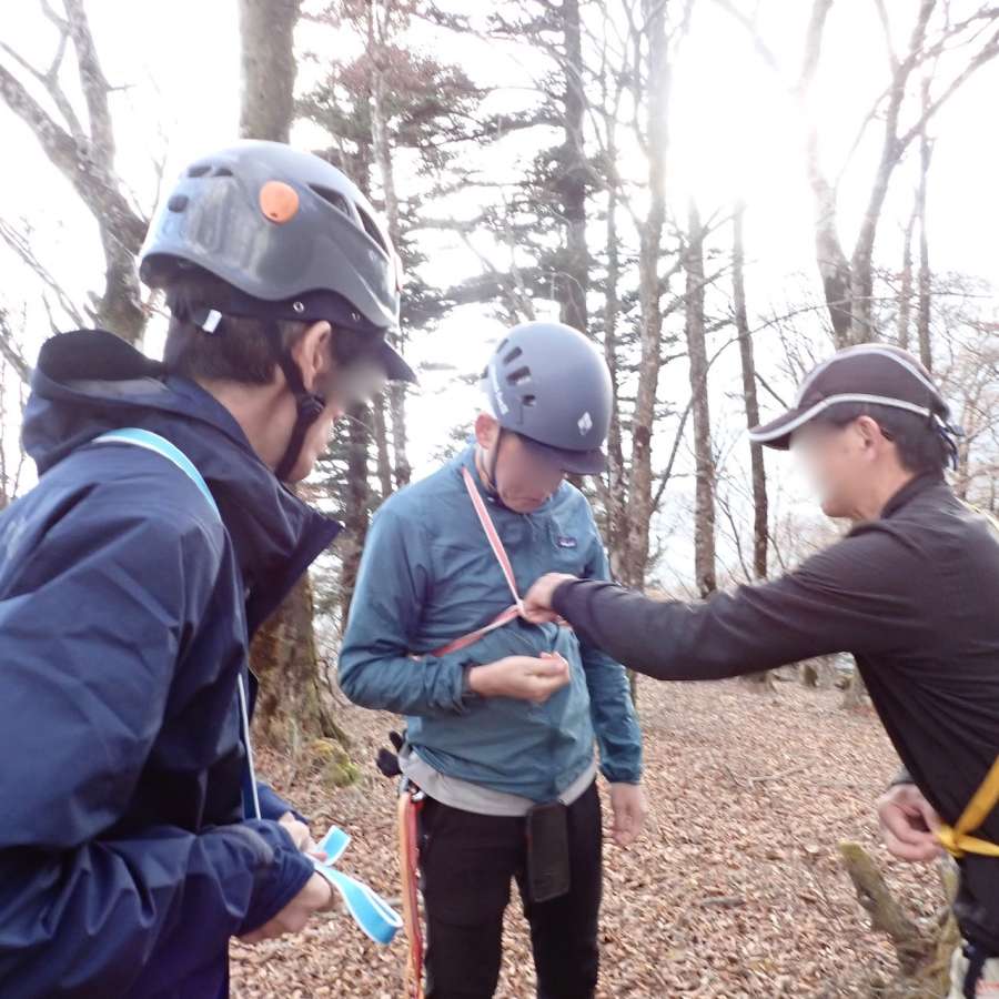 出発が少し遅れたり私の出だしのルート外し等もあって時間が押してしまい、節刀ヶ岳を省略することなりましたが、十二ヶ岳の12のピークを数えながらロープや鎖かかった岩場の登下降を実践できました。相互にサポートし、パーティとしてまとまった行動ができたのも良かったと思います。短時間ですが、簡易ハーネスやスリングランナーの作成と試用もできました(次回は実践で使えるようおさらいしてください)。