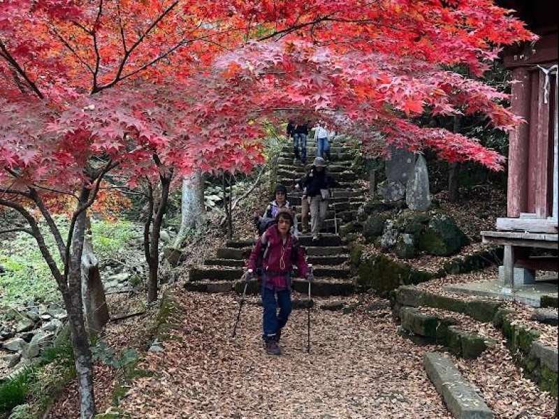 日向薬師バス停で降りたのは私たち7人のみ。急な階段を登り日向薬師で参拝してから梅ノ木尾根の道へ進む。二の沢の頭を過ぎて痩せ尾根になると視界が開けて三峰の紅葉の山肌が見えてくる。鍵掛で道を確認して矢草の頭へとむかう。枯草の積もる急な斜面を登り一般道へ出る。開けた尾根道で昼食を取ってから、急な階段を登り大山へとむかうと、雷の峰尾根の分岐で初めて登山者と出会った。大山山頂では今までの静けさとは違い、沢山の登山者が居たが平日のためそれほど混んではいなかった。ゴロゴロの岩の道を下り下社に着くと明日からのライトアップの準備が進められていた。女坂を下り大山寺に着くと見事な紅葉に思わず感嘆の声が上がる。記念写真を撮ってから下山する。独楽参道で解散して大山豆腐を味わってからロープウエイ駅に下り、満員の臨時バスに乗って伊勢原駅に帰った。