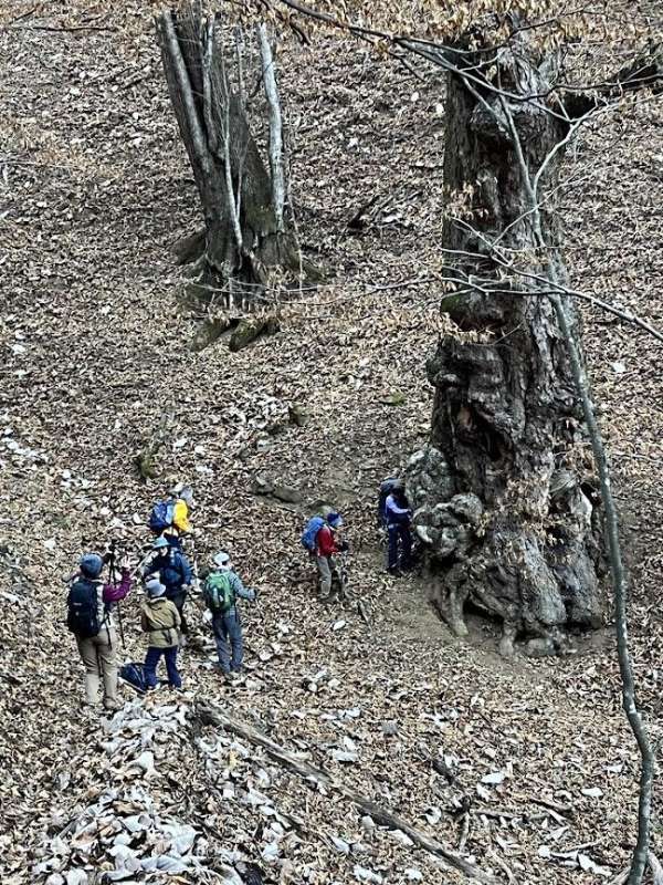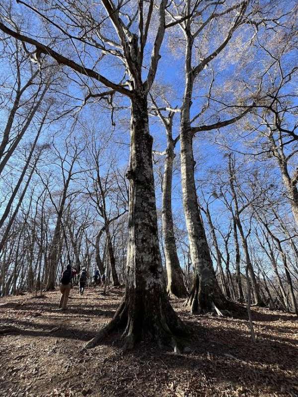 鶴寝山(1,369m)、奈良倉山(1,349m)は大菩薩嶺から三頭山方面へ延びる牛の寝通りと呼ばれる尾根にある。鶴峠バス停から左に取り付き、人工林とカラマツと広葉樹が混じる中、ゆったりと高度を上げていく。すっかり葉は散っており、たくさんの落ち葉と5cmもある霜柱を踏んでの山歩きとなった。落ち葉に根、切り株、渡した板と地面の隙間等が隠れているので要注意。道路を挟んだ向かいには三頭山の三つの緩いピークが見える。富嶽十二景の奈良倉山で富士山と記念撮影をした。ほどなく林道に出ると、松姫峠、山梨県上野原市と東京都小菅村の境界だ。ブナ、ミズナラ等の大木の美しい広葉樹林帯を登っていくと鶴寝山。小菅方面へは「巨樹のみち」と呼ばれ、穏やかに下っていく。推定樹齢600年と言われるトチノキの巨木は圧巻だ。右側が切れている斜面をトラバース気味に歩き、登山道が清流の沢に近づくとワサビ田が出てくる。林道に出て30分ほどで「小菅の湯」バス停に出る。終始富士山がくっきりと望めた。暖かい陽気で、初冬を楽しめた。