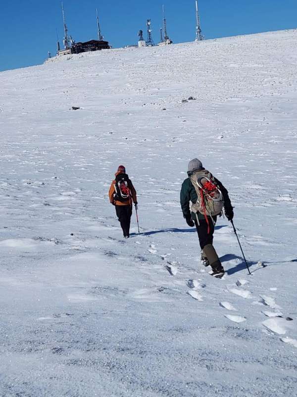 広場まではモフモフの雪、広場からは一直線の急登、近くに見えるのになかなか辿り着けない、滑れば真っ逆さに滑落、前の人のトレース、ステップを利用しそのステップに一足ずつアイゼンの爪を噛ませて一歩、一歩登って行く 強風が吹き付けフードをかぶり手袋2枚しても冷たかった。振り返ると富士山まで見渡せる絶景に励まされ急登に苦戦しながら稜線へ 稜線辿り着くと穂高、槍、笠ヶ岳、霞沢岳、白山、乗鞍の大パノラマ、360°の眺望でした。山頂に着くと風も止んでまさに神のご褒美、まったり出来ました。冬季の南峰はこれで三度目、北峰は一度ですが今回が雲一つ無い快晴でした。この日の登頂者は20人位、北峰はノートレースで 北峰には行かず この日はニ峰クリアは誰もいなかったみたいです。