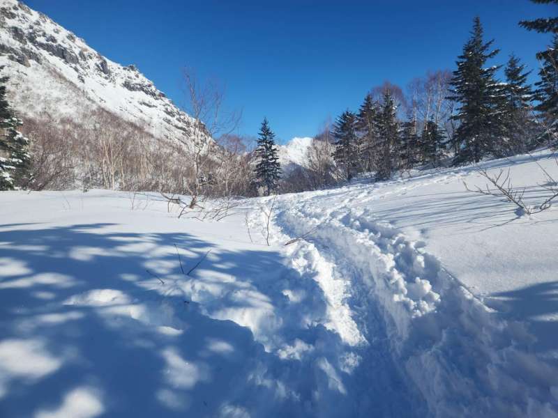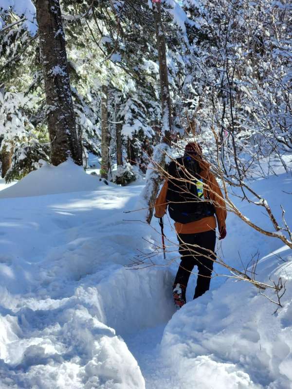 12月29日、2日目は焼岳南峰 夏は行けない冬季限定ルートの南峰へ 新中の湯温泉Pを7時40分にスタート、中の湯からは夏道を使わず尾根を通り登山口へ。雪は新中の湯温泉からしっかりあり最初からアイゼンを着けた。