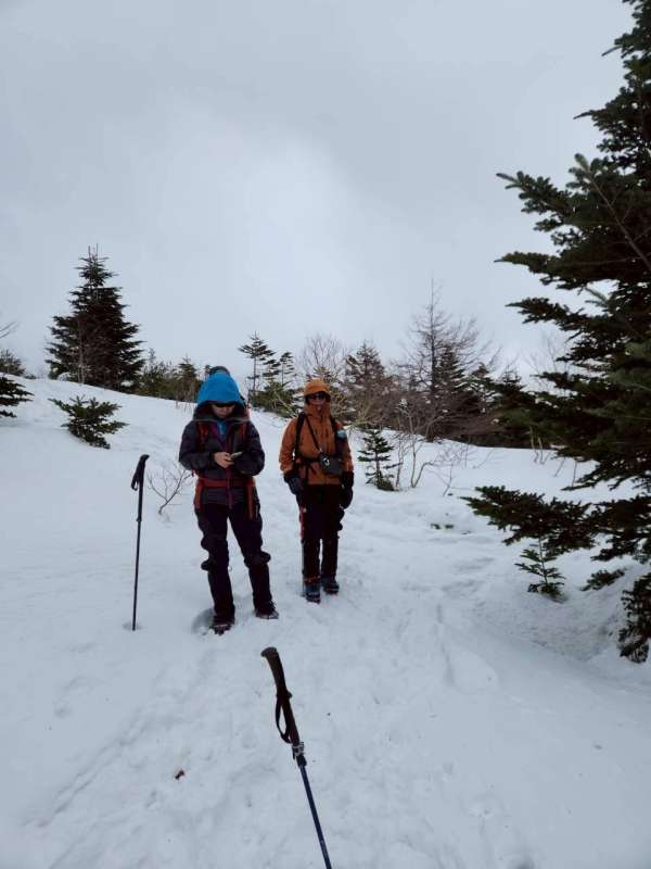 そして翌日の四阿山は高気圧に覆われテンクラも1日中がAのはずでしたがたしかに朝は雲一つない青空であったが稜線に出た頃は雲に覆われ突き刺すような風の冷たさに心が折れた。ワカンを着けるほどでは無いが一足ごと足の沈む四阿山の登りは(塔が岳ピストンよりきつい。)体力を消耗させいつになったら着くのが思ったが山頂の社に着いた時はホットした。菅平牧場からの根子岳~四阿山周回の7~8時間コースはトレース薄くラッセルになりそうで今回は選択しなかったが行ってみて「いい判断だった。」と思った。