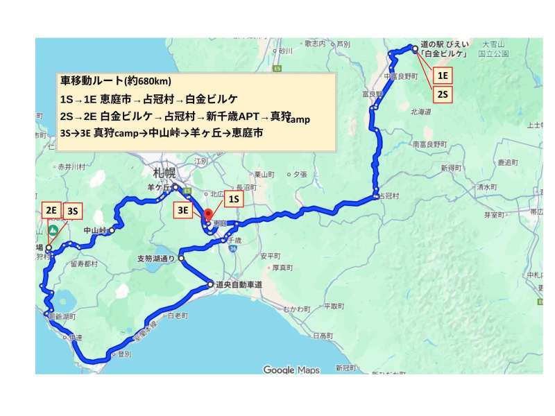 9/12 12:00新千歳空港12:20=12:32恵庭駅=レンタカー会社13:30=18:20美瑛・道の駅「白金ビルケ」(泊)