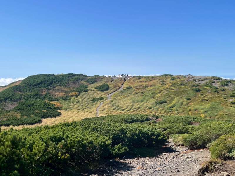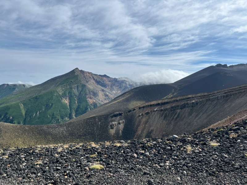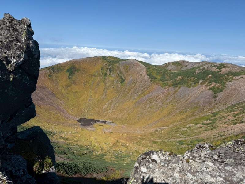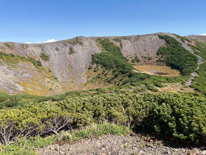 9/15 熊の目撃情報のない山域とのことだったが、やはり北海道の山は熊が…と思っているので怖い。早朝の暗い中は、笛や手叩きなど鳴り物いり。頂上に近づくにつれ、風が強くなってきたが、十勝岳よりはマシ。途中、ガスに包まれるシーンもあったが、山頂やお鉢巡りではガスが吹き飛ばされ、眼下に北海道ならではの雄大な風景が広がり、豊かな開放感を味わった。(SO)