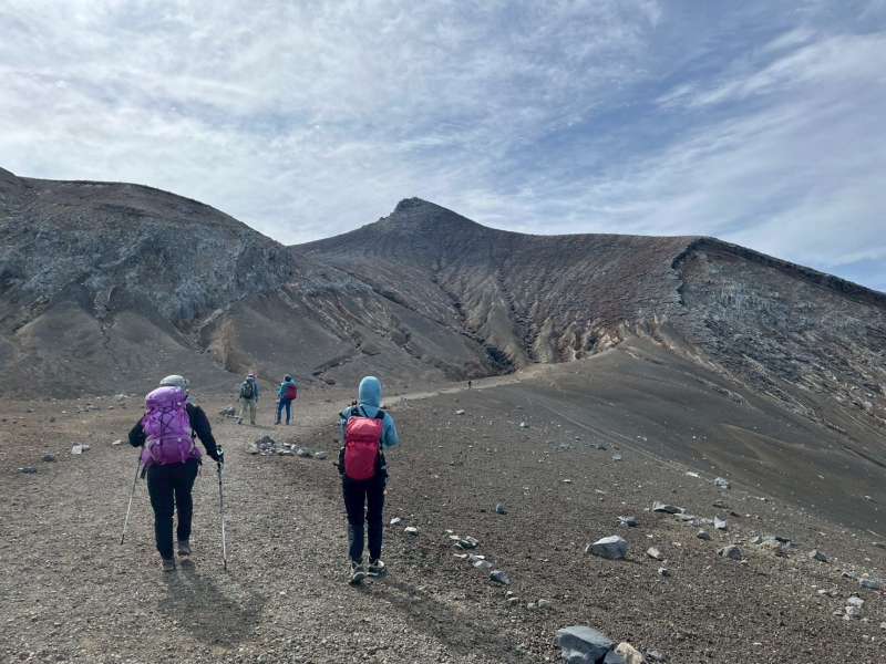望岳台から登り始める。避難小屋を過ぎた辺りから火山のガスが風に乗ってやってきて咳き込んでしまう。昭和火口を過ぎ、なだらかな道が終わると十勝岳への急な山道が始まる。登りやすいが、下りは細かく砕けた溶岩で滑る。(MT)