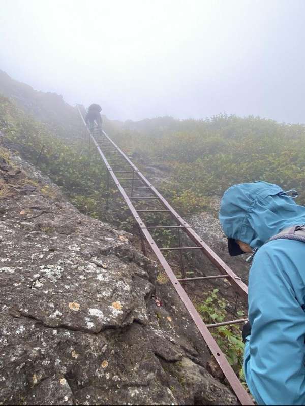 20日ガスガスの中、空身で編笠山へ。初めは昨夜の雨で濡れた岩ゴロゴロで緊張する。その後登山道を進み山頂へ。やはりガスで眺望なし。小屋に戻り権現岳へ。9:30頃から小雨。権現小屋先から岩場が始まる。名物の長い梯子をクリア。キレット小屋を過ぎると傾斜のキツイザレ場。稜線に近づくにつれ岩場になる。雨の中の岩場を慎重に進む。風も強まり赤岳は暴風雨。やっとの思いで赤岳頂上山荘に到着した。
