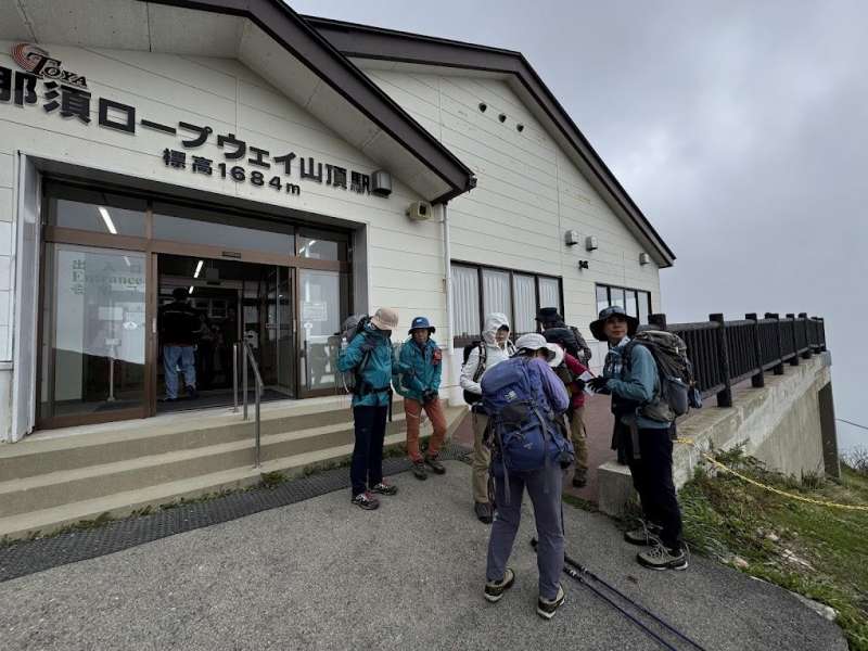 9/29 昨晩中ずっと台風並みの物凄い風雨が続き、私が泊まった部屋は一部雨漏りするほどだった。朝食を終え7:30出発予定だったが雨が残っているので30分ほど遅らせ朝の温泉に入った。途中で雨は上がる予報だが強風が心配。峰の茶屋まで行き、風の様子を見て三本槍登頂を判断しようと決め、登山開始。峰の茶屋到着手前から案の定強風が吹き始める。雨は降ったり止んだり。強風から逃れるように皆んなで峰の茶屋に駆け込んだ。多分風速20m位だったと思う。三本槍登頂は諦め、下山する事に決めた。峰の茶屋から先も、時々身体を持っていかれるような強風が続いた。ロープウェイ山麓駅が近づくにつれ風は次第に止み、天気も回復した。ちょうどバスの発車時刻前に到着できたので、バスで那須塩原駅に向かった。
