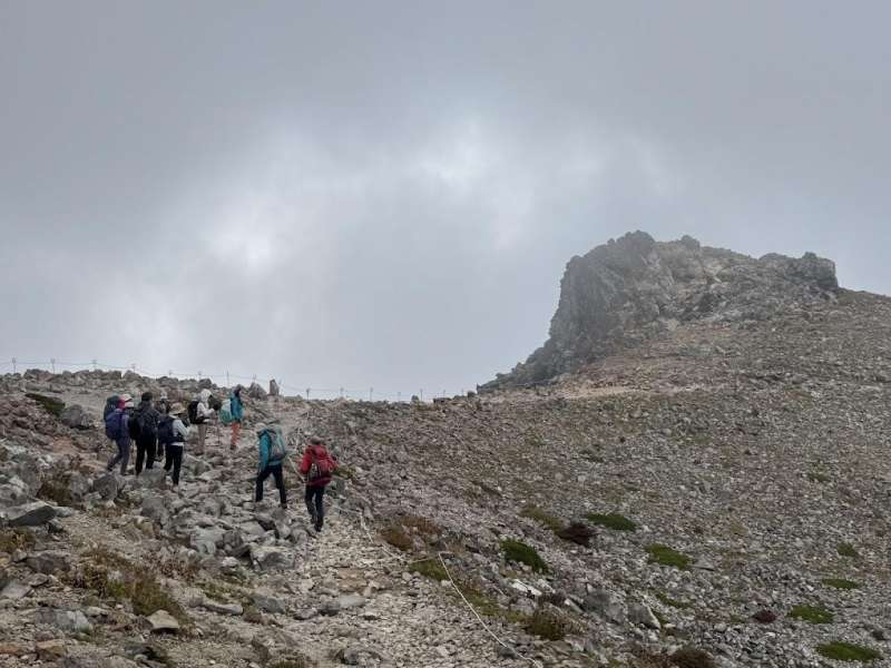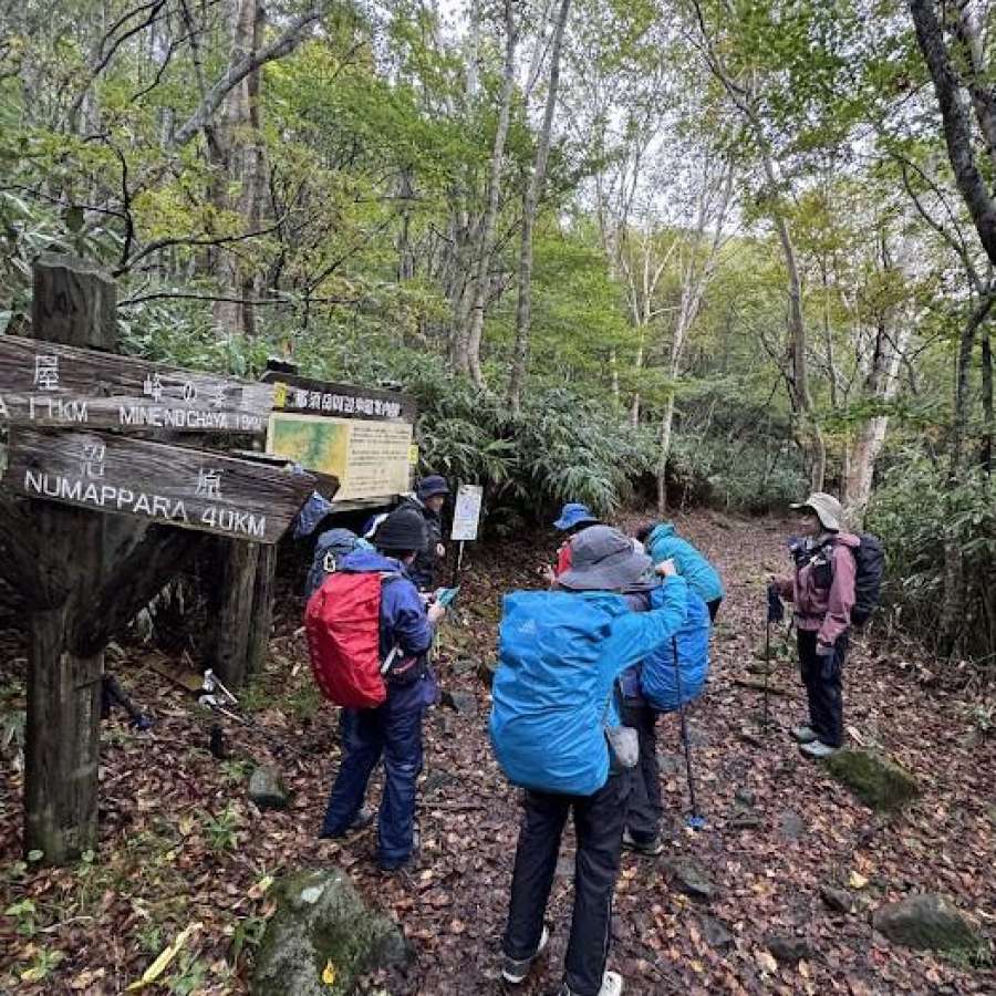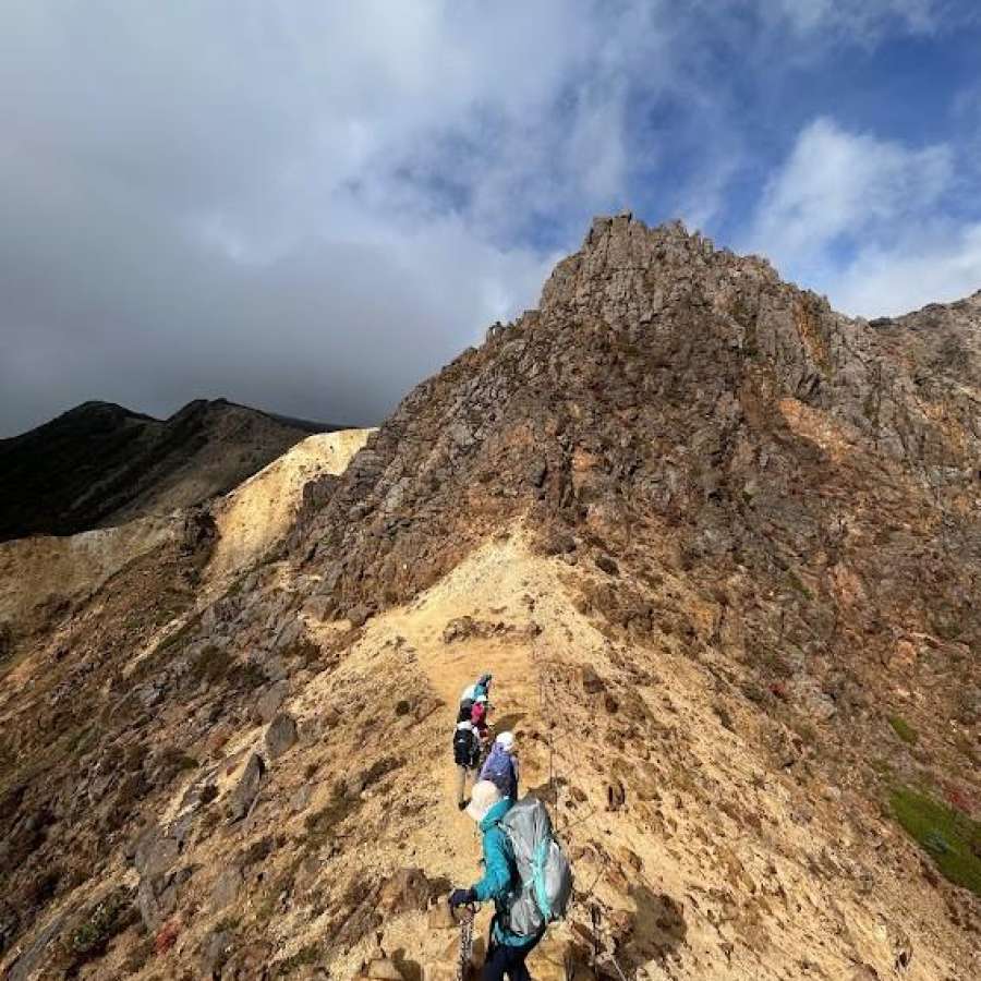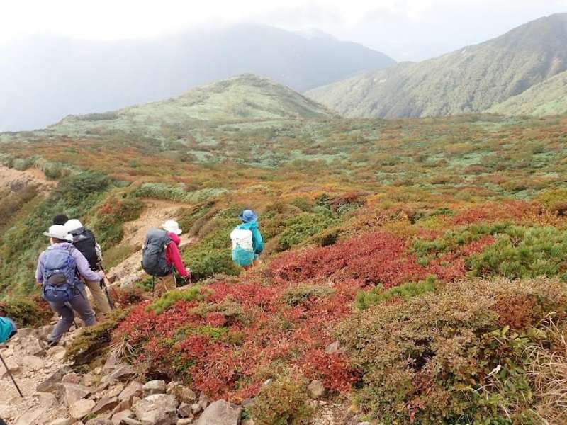 9/28 那須岳ロープウェイ山頂駅まで時間どおり到着。茶臼岳に向かい登山開始から曇りでガス多め。雲の切れ間から時折山頂景色が見え隠れし、景色はコロコロ変わる。茶臼岳に登頂した時も辺りは真っ白だったが、お鉢回りで山頂の祠付近にいた時、少しの間雲が引き、お鉢の中をはっきりと見ることができた。風が強いのでお鉢をまわったら峰の茶屋まで下りる。風の当たらないところで昼食休憩をとった。朝日岳に向かい少し行くと岩稜帯が朝日の肩まで続く。全員問題なく通過していた。朝日の肩にザックを置いて朝日岳登頂。朝日岳山頂では雲が引き、青空も見え、辺りの山並みと始まったばかりの紅葉風景がとても綺麗だった。名残惜しくも朝日岳を跡にして隠居倉への尾根を歩く。隠居倉を通過し、しばらく行くと煙が立ち上っていた。三斗小屋温泉煙草屋の露天風呂源泉だった。そこからまた歩き三斗小屋温泉大黒屋到着。温泉に浸かり、夕食、泊。宿のご主人によると今夜から雨、明日の午前中まで降ったり止んだり。雨が上がると風が強まる予報。明日の三本槍岳は無理しないで、とのこと。