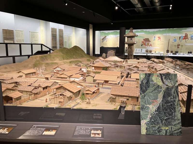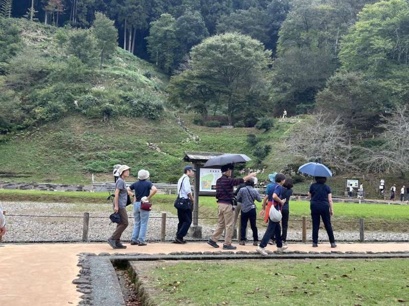 レンタカー3台に分乗して一乗谷朝倉氏遺跡博物館に到着。ちょうど無料ガイドが始まったため、ガイドの後について遺構展示室、基本展示、朝倉館原寸再現の順に館内を見学する。