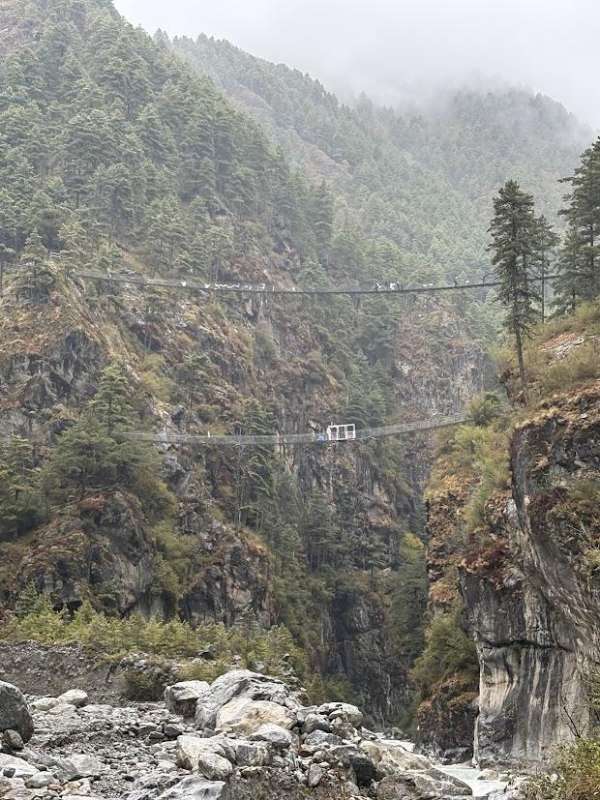 谷沿いの道を歩き、サガルマタナショナルパークのゲートでパスポートチェック、吊り橋を何度か渡りナムチェバザールに到着。雨の為山は全く見えない。