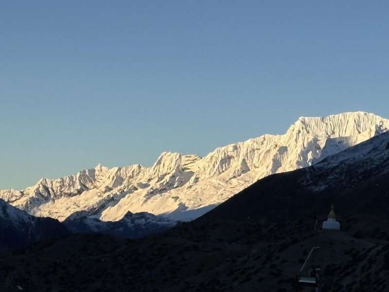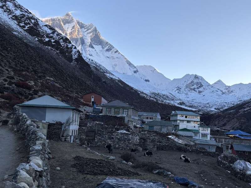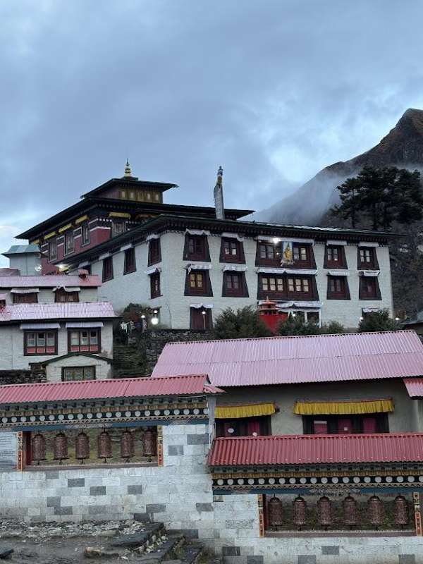 朝、ようやく雲の切れ間からアマダブラムはじめ白い峰々が見えた。日中はやはり雨だったが荷物を運ぶロバやヤクなどと共に楽しく歩きデポチェへ。デポチェはチベット仏教の立派なお寺があり朝5時に鐘がなり大音量でお経が流れていた。