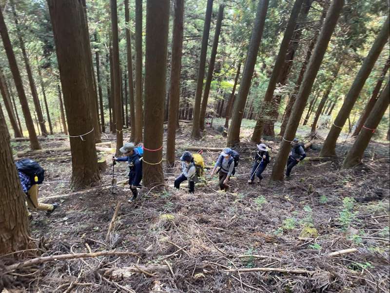 伊勢沢ノ頭で昼食後、地図読み練習をしながら秦野峠への道と分かれて、伊勢沢ノ頭南東尾根のバリコースに入る。植林帯の急斜面をジグザグに下る。やや退屈だが効率は良い。やがて林業車両用の林道に合流して秦野林道に出る。舗装道路を30分歩いて15時に寄大橋駐車場に戻った。