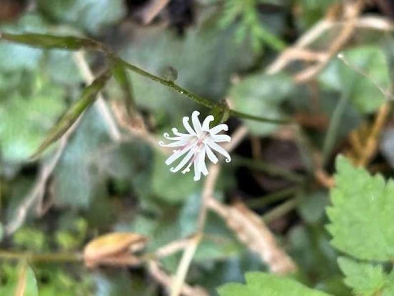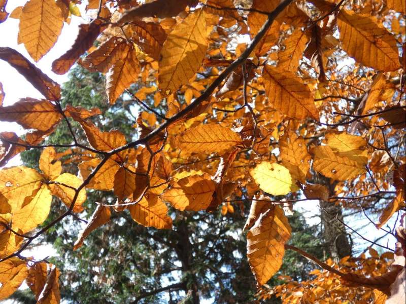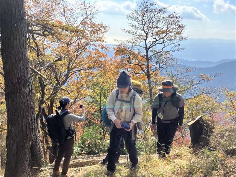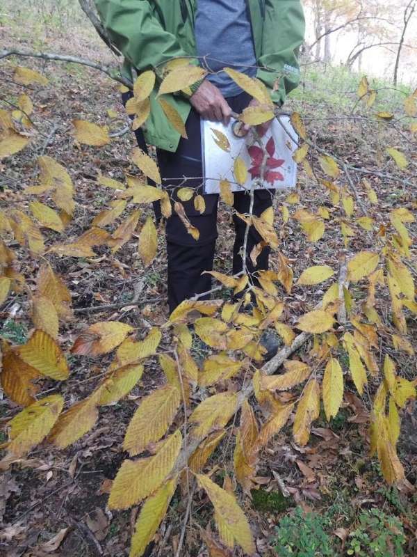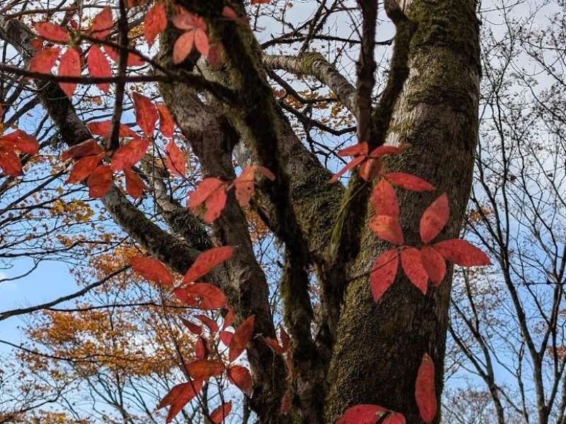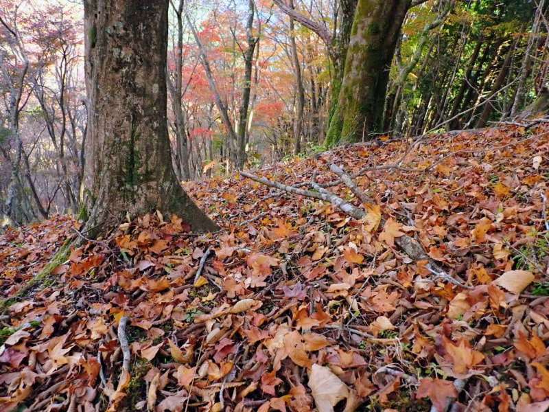 紅葉はお天気次第。丹沢でもこんなに美しい紅葉が見られるんだと感動した1日であった。寄水源林の周遊コースから檜岳南東尾根を登り、伊勢沢ノ頭を経由して伊勢沢ノ頭南東尾根を降りて寄大橋に戻る周回コース。はじめは植林帯を歩くが、檜岳南東尾根の南斜面は豊かな広葉樹林だ。標高が低いところのケヤキから始まり、イロハモミジ、オオモミジ、イタヤカエデ、ウリハダカエデ、稜線にはブナ林が広がり、多くはないがヒナウチワカエデ、メグスリノキ、チドリノキも見られた。足元にはリンドウやセンブリ、キッコウハグマがシーズン最後の花を咲かせていた。檜岳へは雨山峠からアプローチする道の方がより面白そうだが、寄水源林から雨山峠への道は長らく通行禁止となっており残念だ。