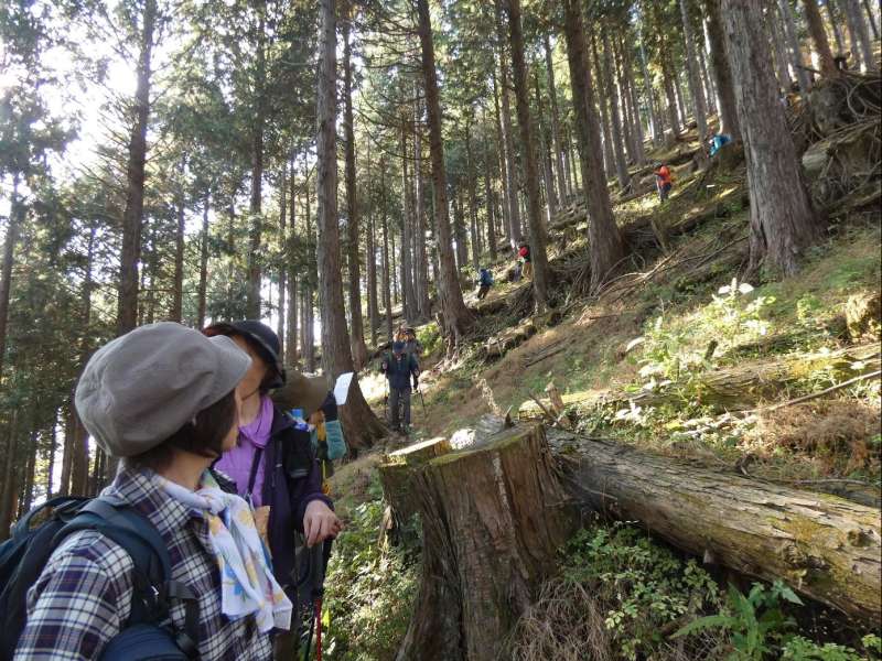 藤沢駅南口6:45・平塚駅南口7:00=車=8:00寄大橋8:25-やどりき水源林周遊歩道Aコース⑤⑤-⑩檜岳南東尾根-11:10檜岳(ひのきだっか)11:25-12:05伊勢沢ノ頭(昼食)12:35-伊勢沢ノ頭南東尾根-⑩-14:30秦野峠林道-14:55寄大橋