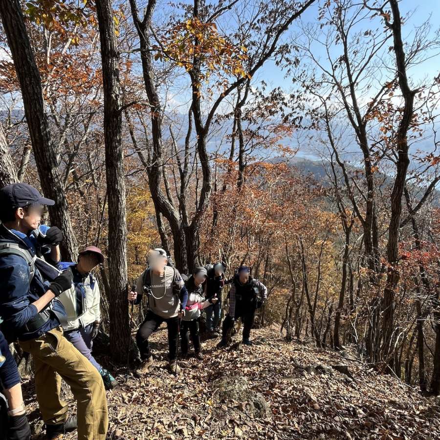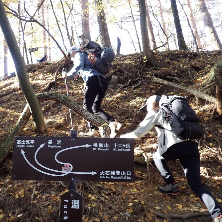 今年2回目の岩稜歩きのトレーニング山行。マイナーな登山口から淵坂峠に向かう薄い踏み跡で一時ルートを失うが地図読みをしてリカバー。峠からは明るい稜線を毛無山まで登り、ヘルメット等を装着して十二のピークを数えつつ岩稜を辿る。メンバー相互に確認しつつ鎖やロープを辿り十二ヶ岳に登りついた。少し寒気の雲もかかるが時々富士も顔を出す晩秋の好天の下、河口湖や西湖を眺める。下りも一か所大きなギャップがあるが慎重に越える。10人の大パーティだったこともあり夕暮れが迫る時間となったので、直接大淵谷を登山口に下るルートと変更したが、その前にスリングによる簡易ハーネスとカラビナランナーによる鎖場通過の練習を実施。最後は林道でヘッドランプを出すこととなったが安全に下山した。よいパーティで楽しい山行であった。