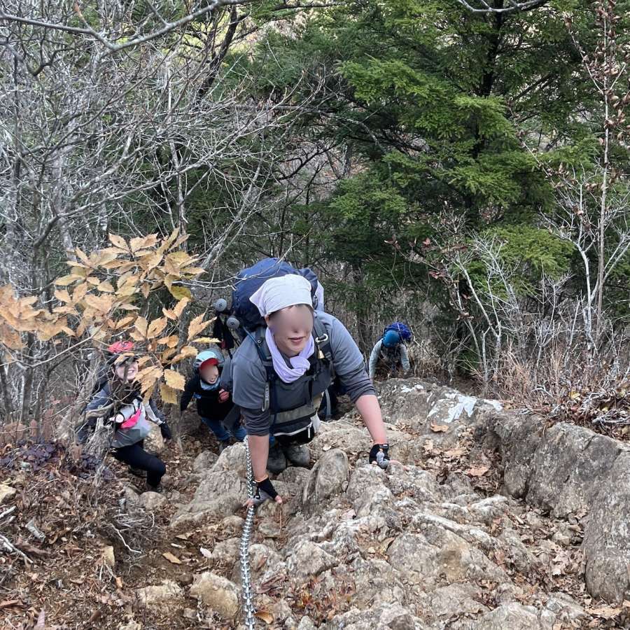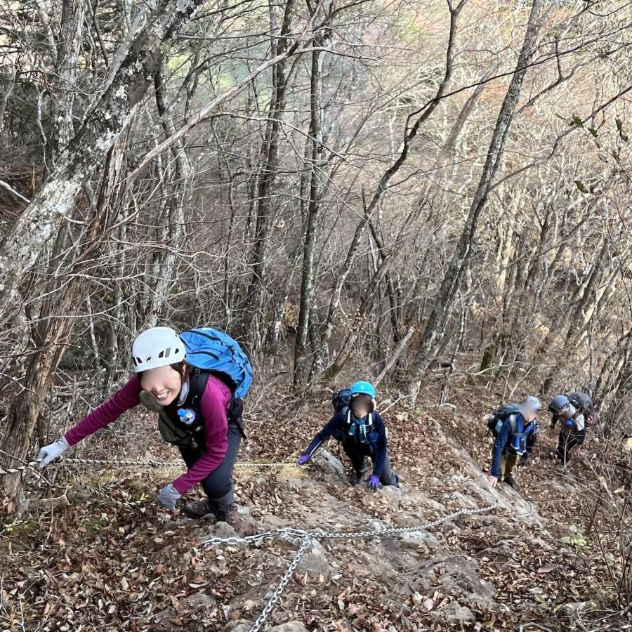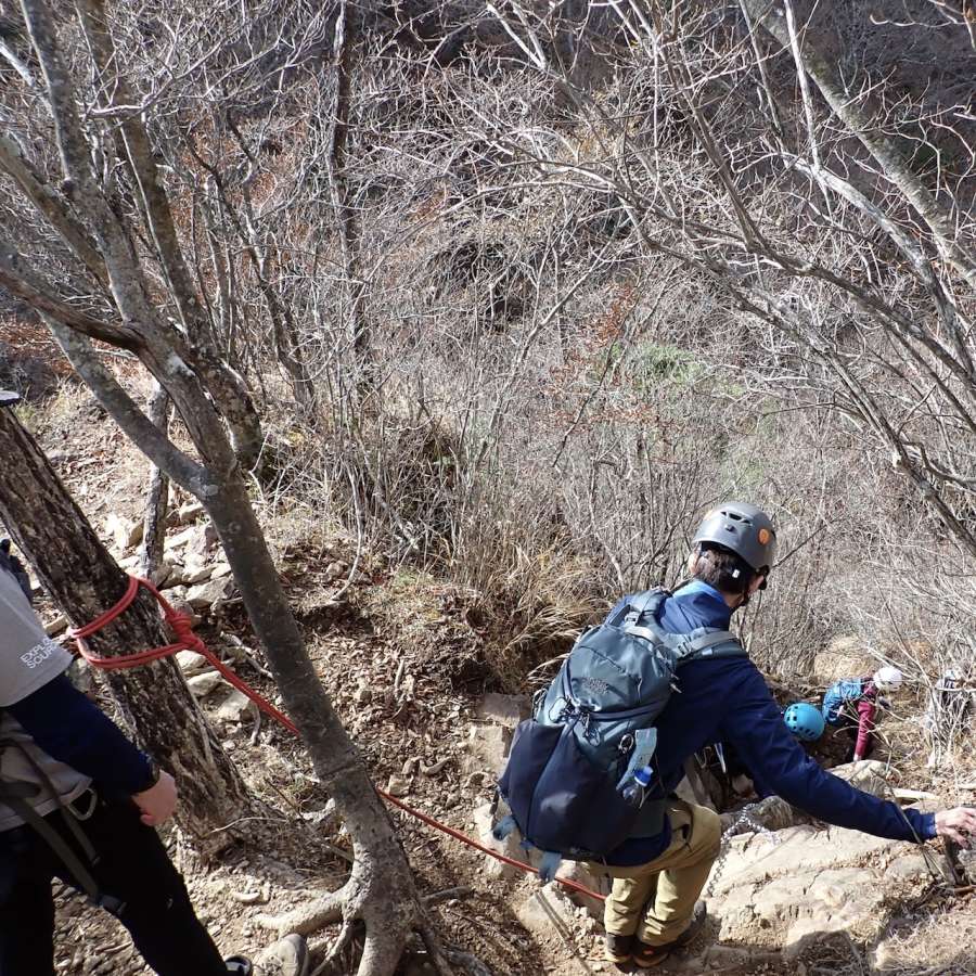 出発が少し遅れたり私の出だしのルート外し等もあって時間が押してしまい、節刀ヶ岳を省略することなりましたが、十二ヶ岳の12のピークを数えながらロープや鎖かかった岩場の登下降を実践できました。相互にサポートし、パーティとしてまとまった行動ができたのも良かったと思います。短時間ですが、簡易ハーネスやスリングランナーの作成と試用もできました(次回は実践で使えるようおさらいしてください)。