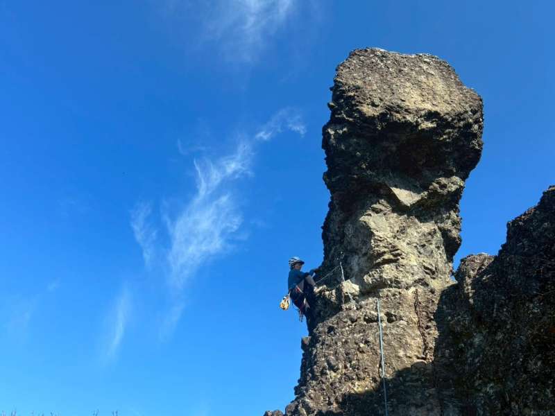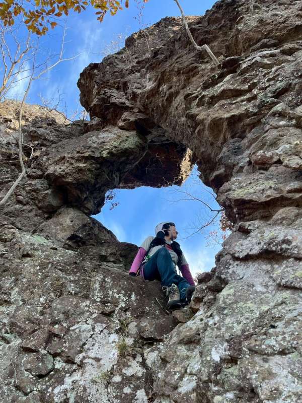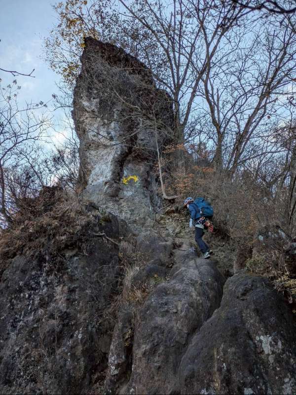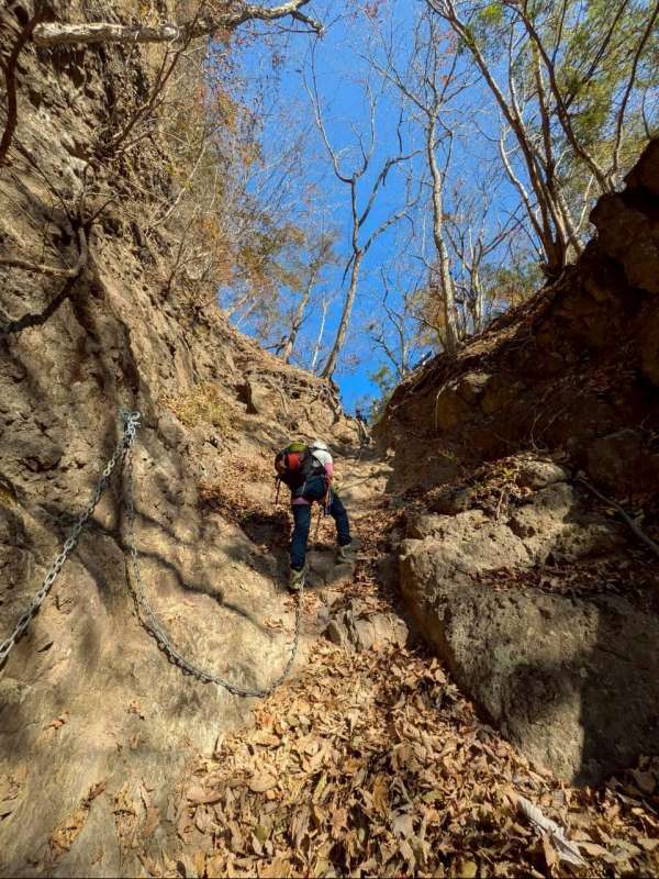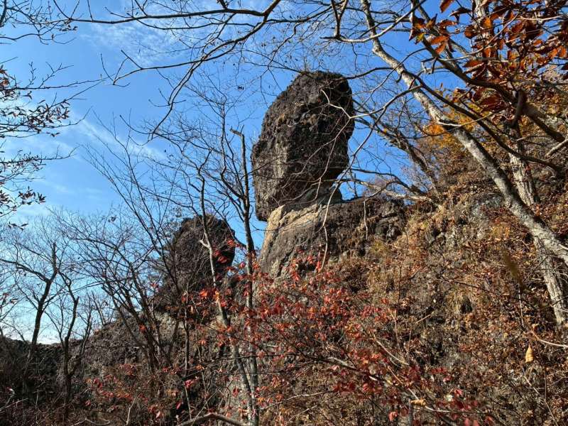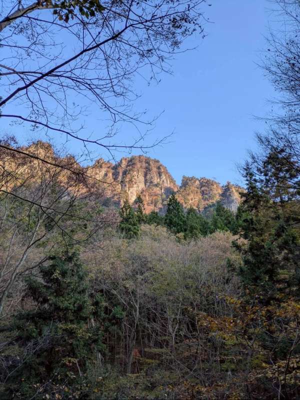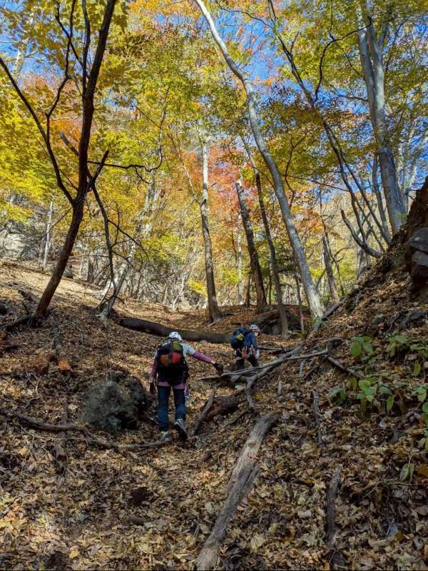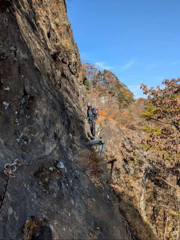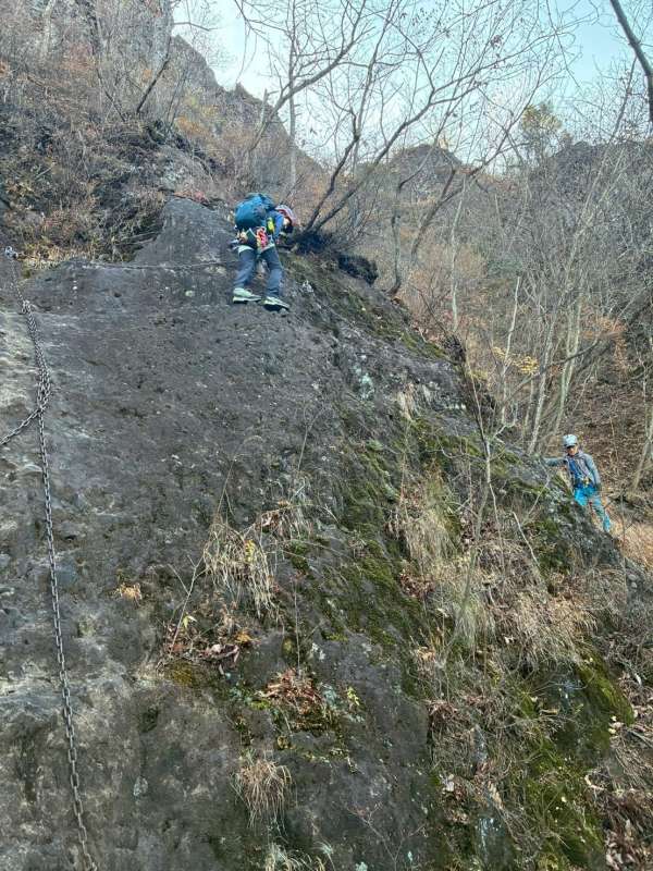 旧国民宿舎登山口から40分程の登りでマルチピッチルートの木戸壁に着く。本日のメインは丁須岩なのでちょっと偵察のつもりでしたが、SL、Mさんはやはりクライミングルートを登ってみたくなり(確信犯的?)、ロープ準備。なぜか持参のクライミングシューズをお出しになり、Kさんリードで1ピッチ2名クライミング。マルチピッチに来ていた別パーティの方々も温かい気持ちでお待ちくださり大変ありがたかった。さて、本日はハイキングです!先を進みます。朝日の差し込む紅葉の中、適度な岩や鎖も楽しく丁須岩(ハンマーヘッド)の肩に着く。大混雑も予想されましたが、先行は3名パーティーのみ。待ち時間に浅間山や荒船や八ヶ岳の景色を楽しみ行動食を補給。いよいよ丁須岩へ。Kさんがリードで登り上からビレイしていただいて4人登頂。素晴らしい高度感に圧巻の景色。向かいの岩峰の方々と手を振り合ったりも楽しかった。次は対岸の岩峰経由で三方境方面へ下りる。序盤の20mチムニーは鎖も設置されているが懸垂下降で通過。赤岩、烏帽子岩と岩を巻く鎖のトラバースが続く。風穴はのぞくと冷たい風が吹いていた。日本三大奇景とされる妙義山。不思議な形の岩峰を眺めなら飽きることなく歩いた。三方境からは岩、鎖はなくなる。けれども滑る落ち葉は油断ならず、最後まで気を引き締めてゴールしました。
