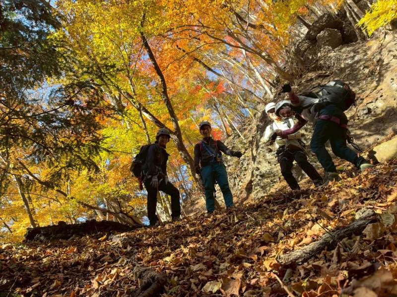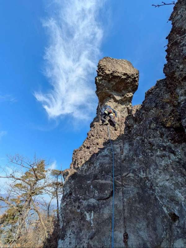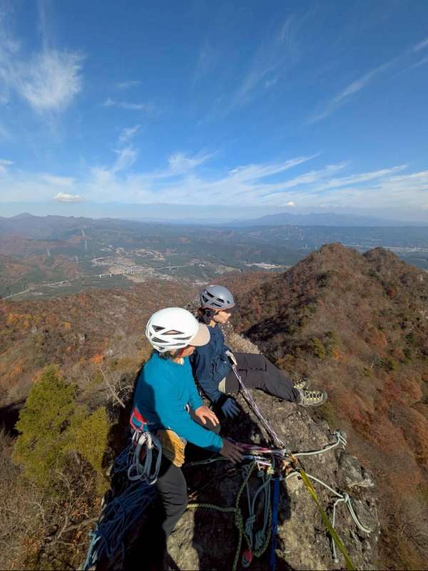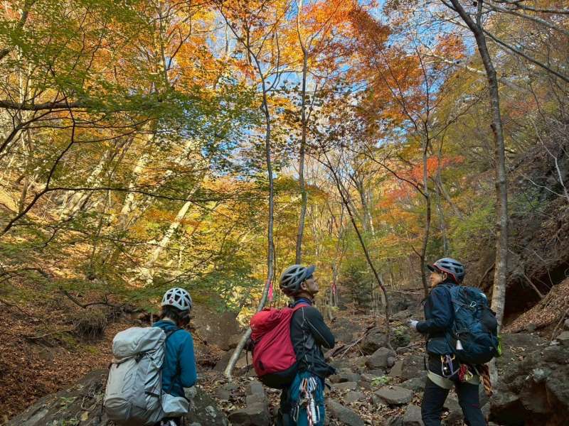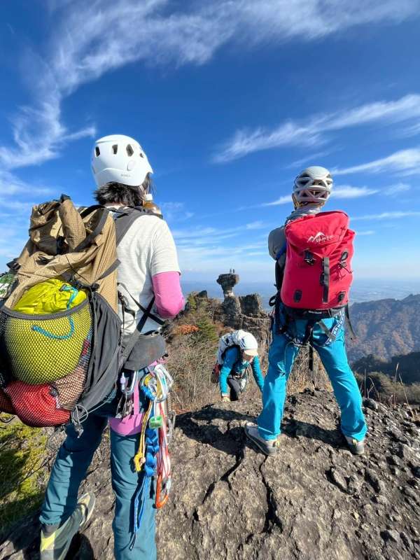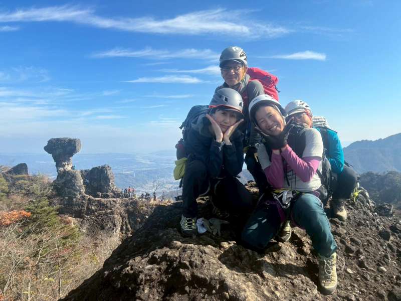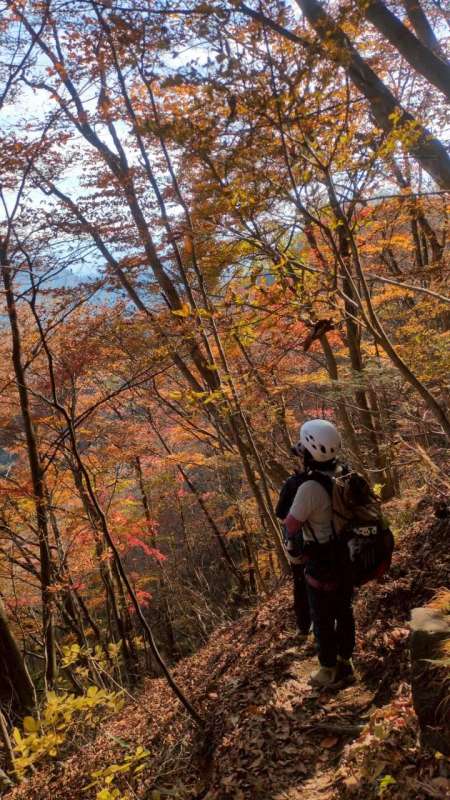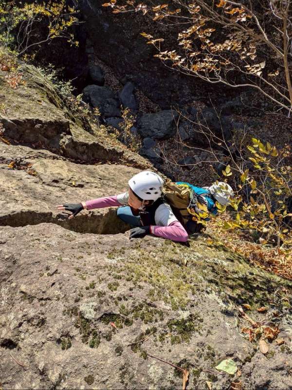 いつか登りたいと思っていた特徴的な岩峰、裏妙義丁須岩。岩を越え鎖を登り懸垂下降を楽しんでアスレチック感満載な錦秋の裏妙義を堪能しました。ベテランクライマー Mさん、Kさんの的確なご指示やフォローにより全行程安全に楽しく進むことができ感謝でいっぱいです。またムードメーカーのジャンダルムKちゃん(略称J)、いつもお菓子補給ありがとうございます。美味しくいただきました。クライミングを始めて山の楽しさが広がりましたが、今回このルートを踏破できたことでさらに岩峰の楽しさを実感しました。西上州には素敵な岩峰がたくさんあるので、またみなさまとご一緒できたら嬉しいです。