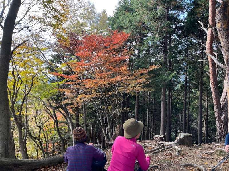 日向薬師バス停で降りたのは私たち7人のみ。急な階段を登り日向薬師で参拝してから梅ノ木尾根の道へ進む。二の沢の頭を過ぎて痩せ尾根になると視界が開けて三峰の紅葉の山肌が見えてくる。鍵掛で道を確認して矢草の頭へとむかう。枯草の積もる急な斜面を登り一般道へ出る。開けた尾根道で昼食を取ってから、急な階段を登り大山へとむかうと、雷の峰尾根の分岐で初めて登山者と出会った。大山山頂では今までの静けさとは違い、沢山の登山者が居たが平日のためそれほど混んではいなかった。ゴロゴロの岩の道を下り下社に着くと明日からのライトアップの準備が進められていた。女坂を下り大山寺に着くと見事な紅葉に思わず感嘆の声が上がる。記念写真を撮ってから下山する。独楽参道で解散して大山豆腐を味わってからロープウエイ駅に下り、満員の臨時バスに乗って伊勢原駅に帰った。