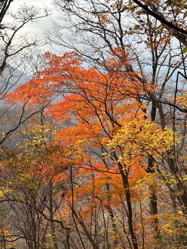 行動開始とともに雲が厚くなり、山頂からの眺望が限定的だったのが残念だった。紅葉はピークを過ぎていたものの、まだまだ十分美しかった。