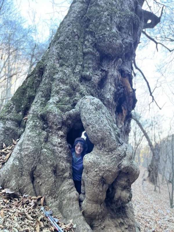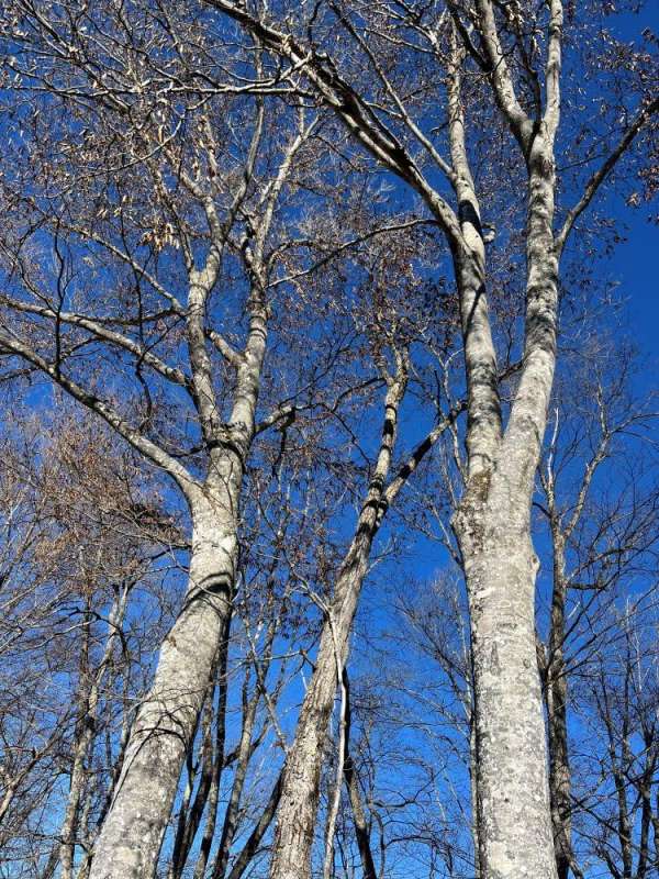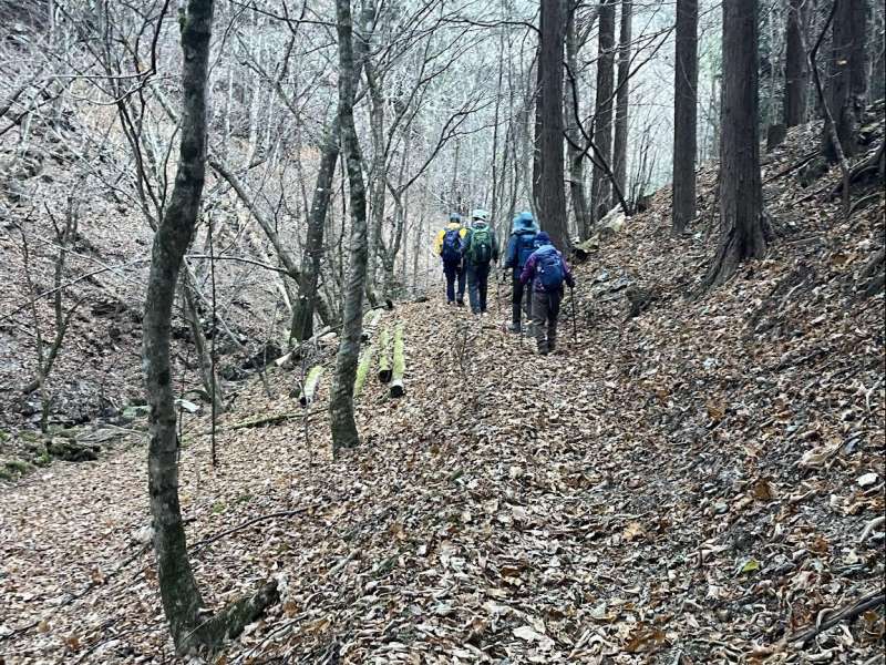 鶴寝山(1,369m)、奈良倉山(1,349m)は大菩薩嶺から三頭山方面へ延びる牛の寝通りと呼ばれる尾根にある。鶴峠バス停から左に取り付き、人工林とカラマツと広葉樹が混じる中、ゆったりと高度を上げていく。すっかり葉は散っており、たくさんの落ち葉と5cmもある霜柱を踏んでの山歩きとなった。落ち葉に根、切り株、渡した板と地面の隙間等が隠れているので要注意。道路を挟んだ向かいには三頭山の三つの緩いピークが見える。富嶽十二景の奈良倉山で富士山と記念撮影をした。ほどなく林道に出ると、松姫峠、山梨県上野原市と東京都小菅村の境界だ。ブナ、ミズナラ等の大木の美しい広葉樹林帯を登っていくと鶴寝山。小菅方面へは「巨樹のみち」と呼ばれ、穏やかに下っていく。推定樹齢600年と言われるトチノキの巨木は圧巻だ。右側が切れている斜面をトラバース気味に歩き、登山道が清流の沢に近づくとワサビ田が出てくる。林道に出て30分ほどで「小菅の湯」バス停に出る。終始富士山がくっきりと望めた。暖かい陽気で、初冬を楽しめた。