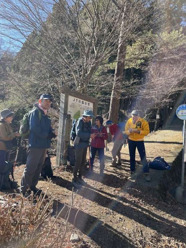 上野原駅8:35=バス=9:42鶴峠10:00-⑤-11:20奈良倉山11:30-12:10松姫峠(昼食)12:30-12:55鶴寝山13:00-13:35巨木トチノキ13:45-14:30林道-15:00小菅の湯バス停15:20=バス=16:42上野原駅