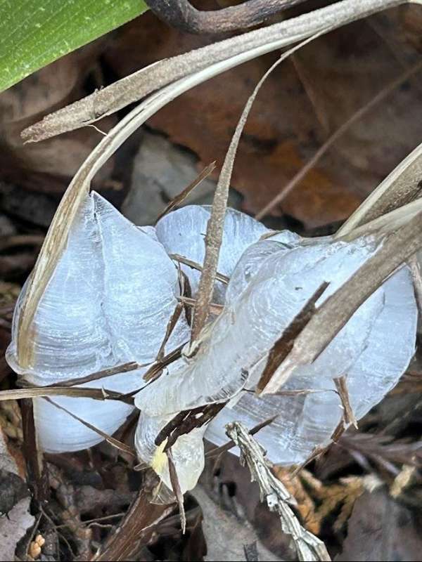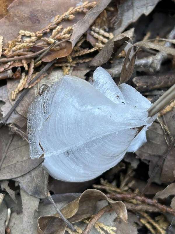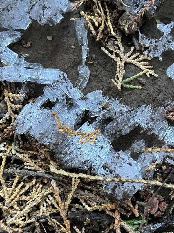 4年前の同じ時期に大洞山を訪れ、初めてシモバシラを見た時の感動を忘れられず、是非もう一度見たいという気持ちで観察会を計画した。雨の後、数日晴天が続き、朝晩の冷え込みも厳しくなってきたので期待していたが、願い通りいくつかのシモバシラを見つけることができた。小ぶりだが、色々な形があり、それぞれ清楚で美しかった。シモバシラは、天候などの環境条件が揃わないと見られないので、今日は、本当に幸運だった。