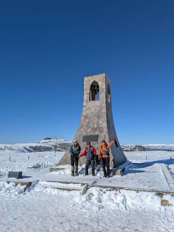 2月28日、初日の美ヶ原はビーナスラインは冬季通行止で県道178号線で山本小屋ふるさと館まで行き山本小屋ふるさと館駐車場を利用させて貰った。王ヶ頭から王ヶ鼻、帰りはアルプス展望コースを烏帽子岩を通って歩いた。王ヶ鼻は日本百名山の3分の1近い山々を一望出来る素晴らしいスポットでまさに日本の屋根の展望台であった。北アルプスの大展望と全面真っ白、柵の中はそのままでも歩け大雪原でのハイキングを楽しめた。