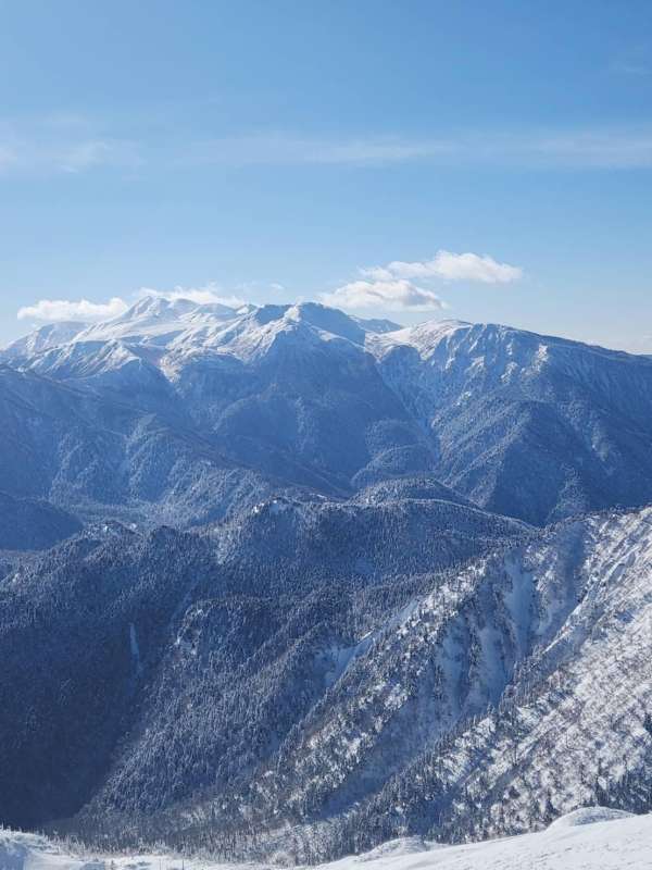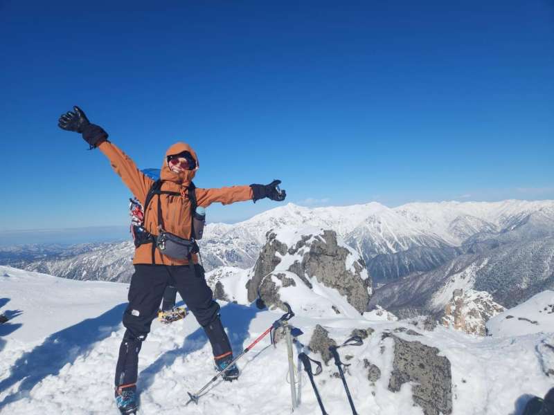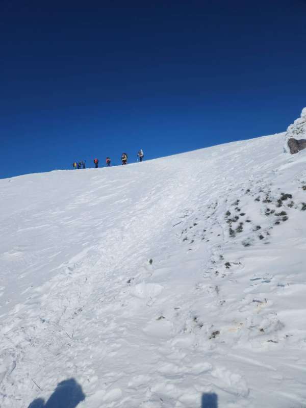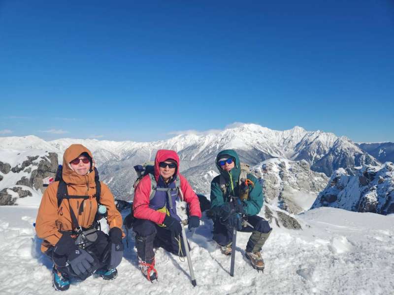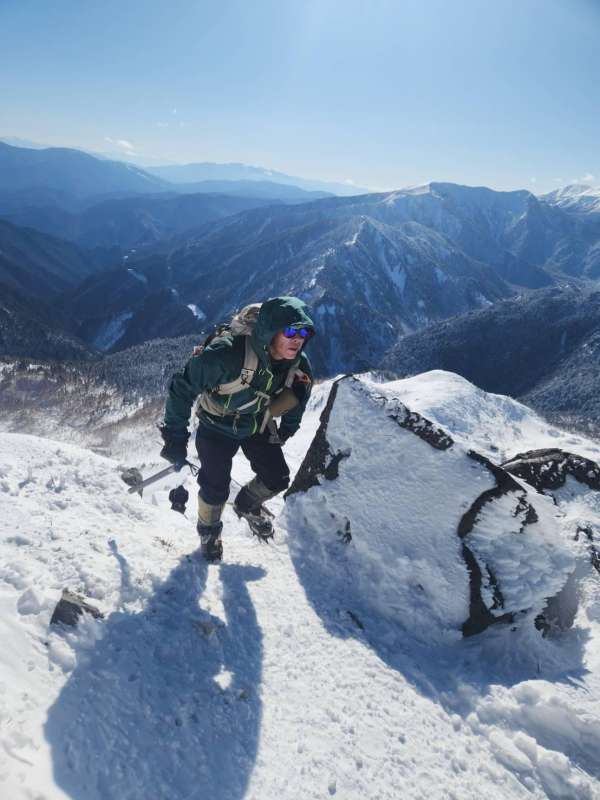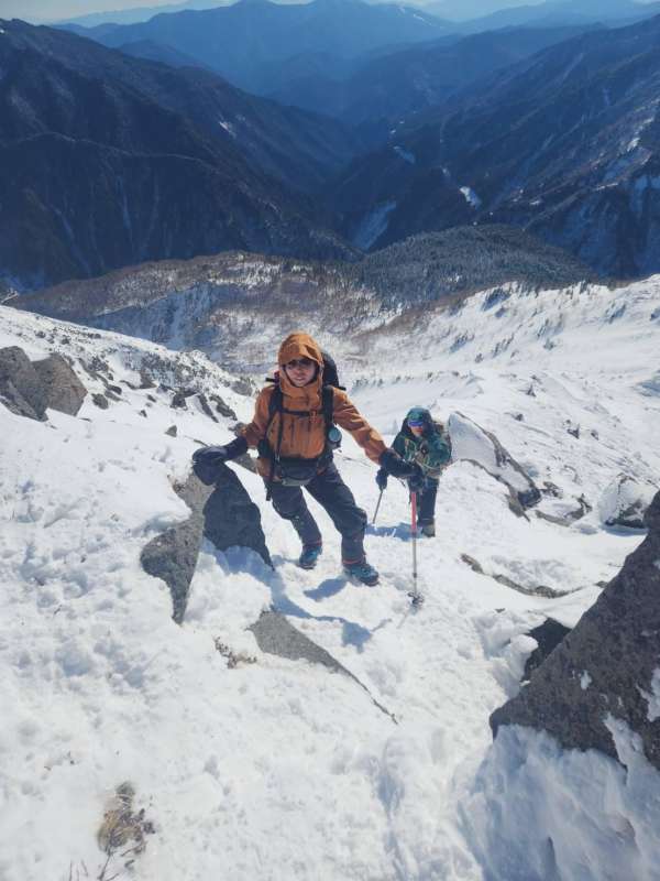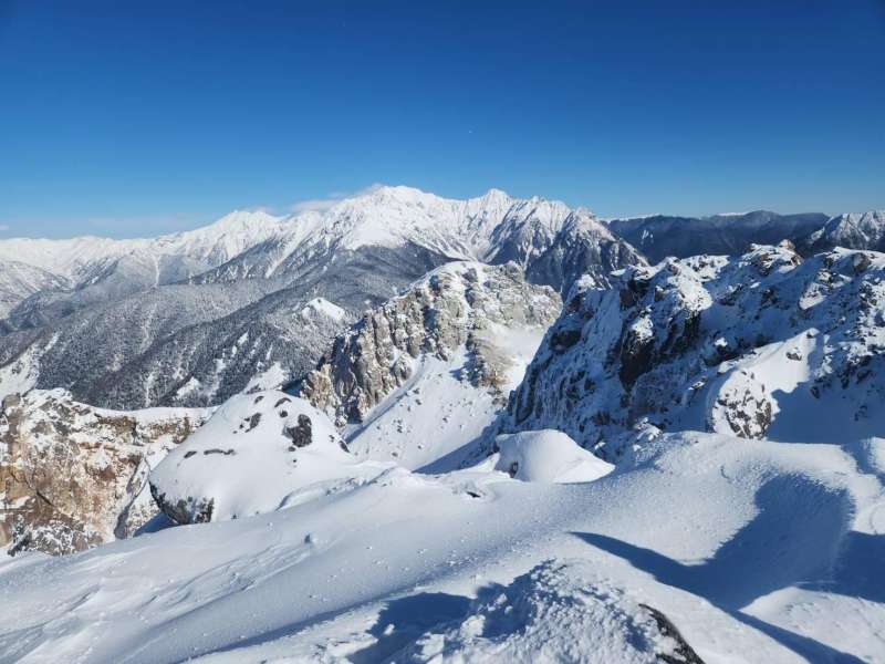 広場まではモフモフの雪、広場からは一直線の急登、近くに見えるのになかなか辿り着けない、滑れば真っ逆さに滑落、前の人のトレース、ステップを利用しそのステップに一足ずつアイゼンの爪を噛ませて一歩、一歩登って行く 強風が吹き付けフードをかぶり手袋2枚しても冷たかった。振り返ると富士山まで見渡せる絶景に励まされ急登に苦戦しながら稜線へ 稜線辿り着くと穂高、槍、笠ヶ岳、霞沢岳、白山、乗鞍の大パノラマ、360°の眺望でした。山頂に着くと風も止んでまさに神のご褒美、まったり出来ました。冬季の南峰はこれで三度目、北峰は一度ですが今回が雲一つ無い快晴でした。この日の登頂者は20人位、北峰はノートレースで 北峰には行かず この日はニ峰クリアは誰もいなかったみたいです。
